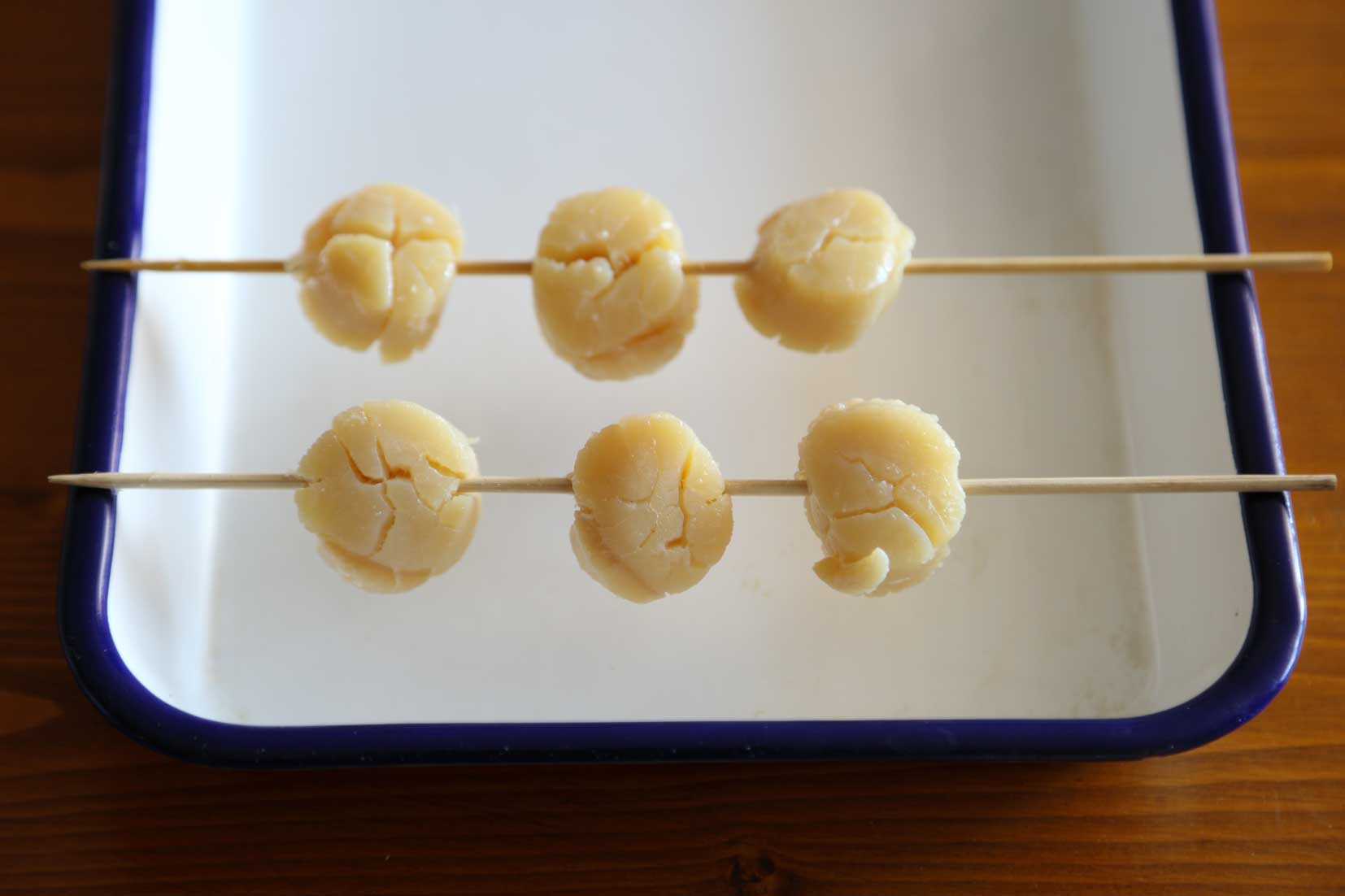 貝柱は、大さじ1/2の塩を加えた水80mlで茹でて汁気がなくなるまで煮詰める。乾きやすいように、竹串に刺して1週間程度乾かす。
