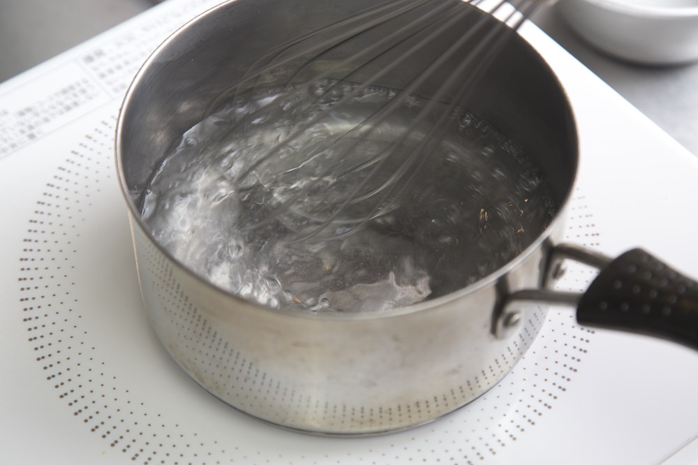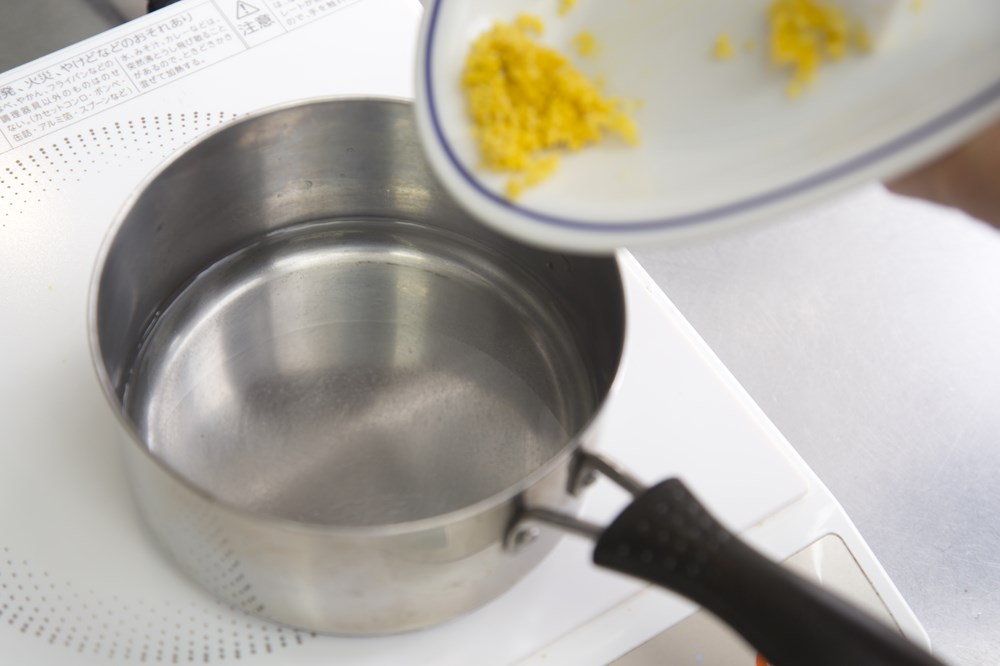 シロップを作る。鍋に水、グラニュー糖を入れて火にかける。