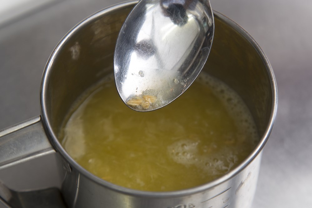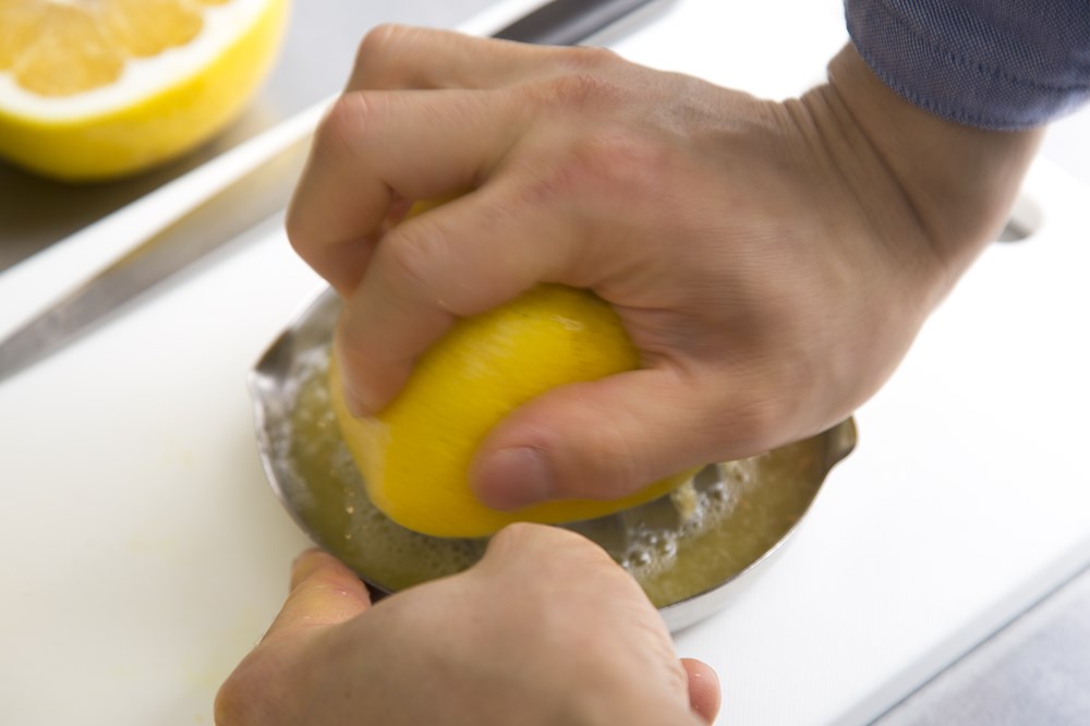 河内晩柑の果汁を搾る。果肉を入れるために果汁を濾さないので、種はスプーンで取り除く。
