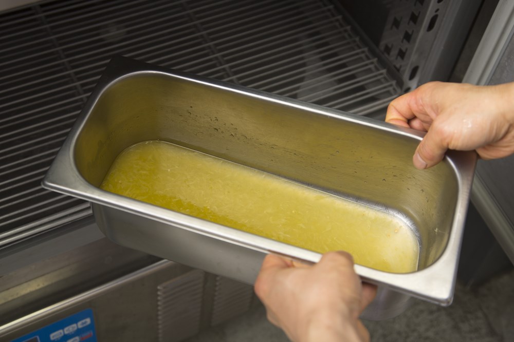 約1時間後。外側が凍っているが、中心はまだ水っぽい状態になったら取り出す。POINT:冷凍庫によって冷凍時間が変わる。