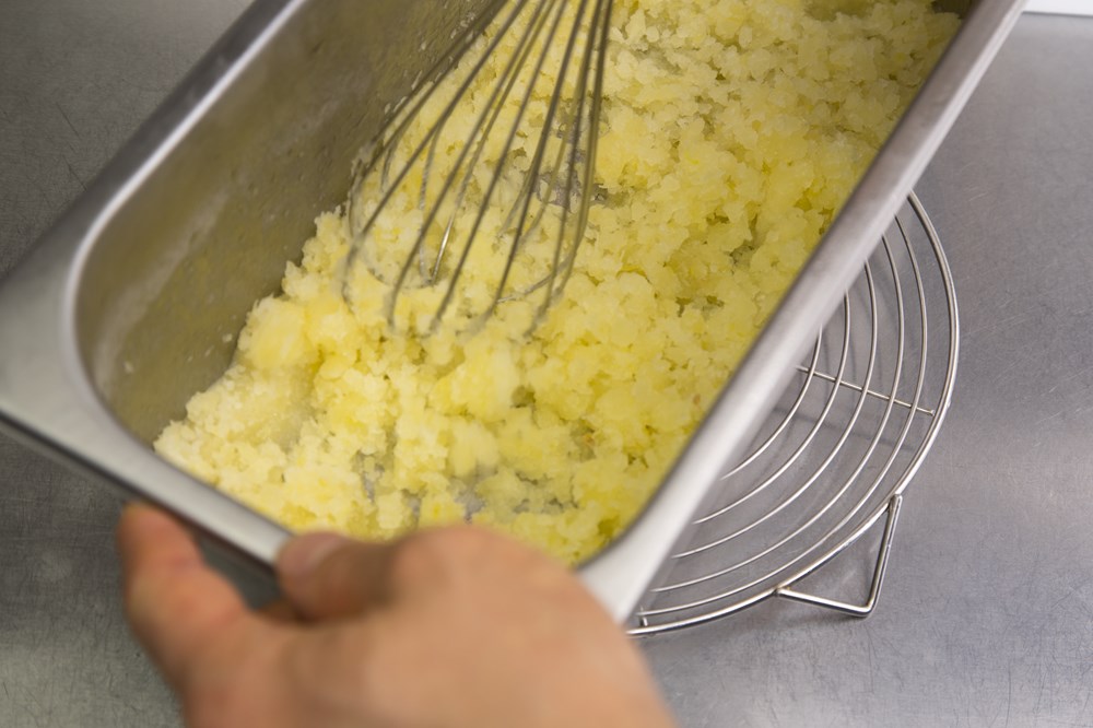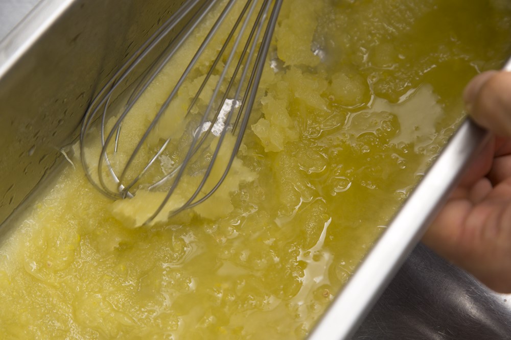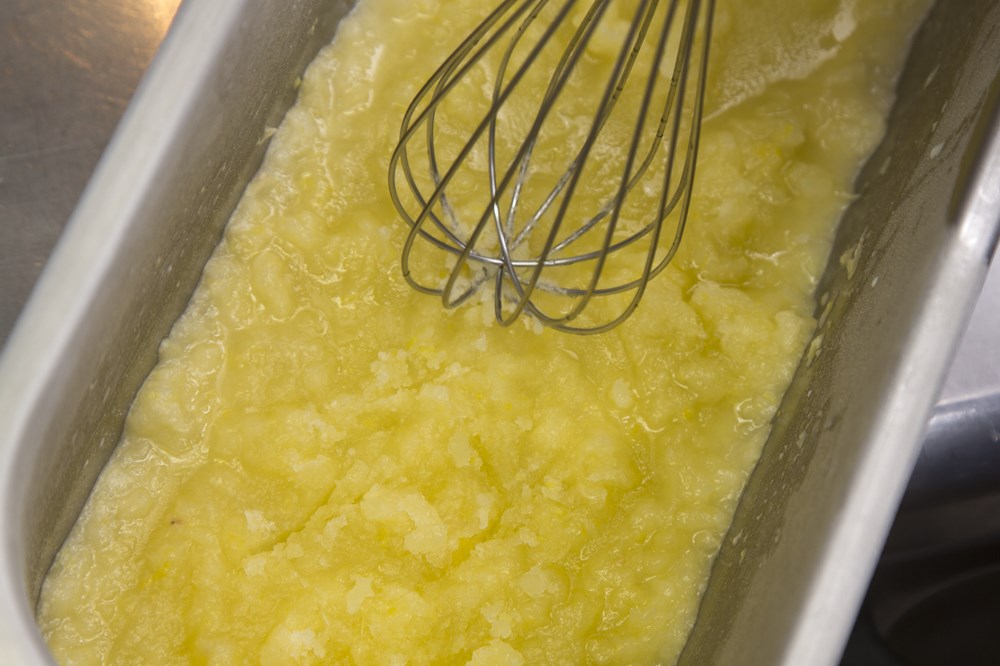 ホイッパーで潰すように粗めに混ぜ、再び冷凍庫に入れる。POINT:底面が溶けないようにケーキクーラーなどの上で作業する。