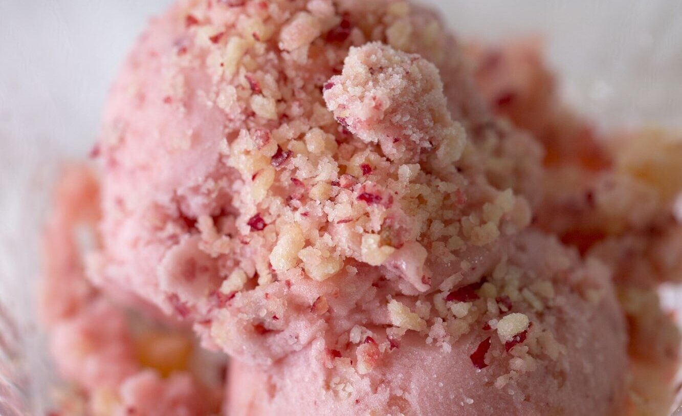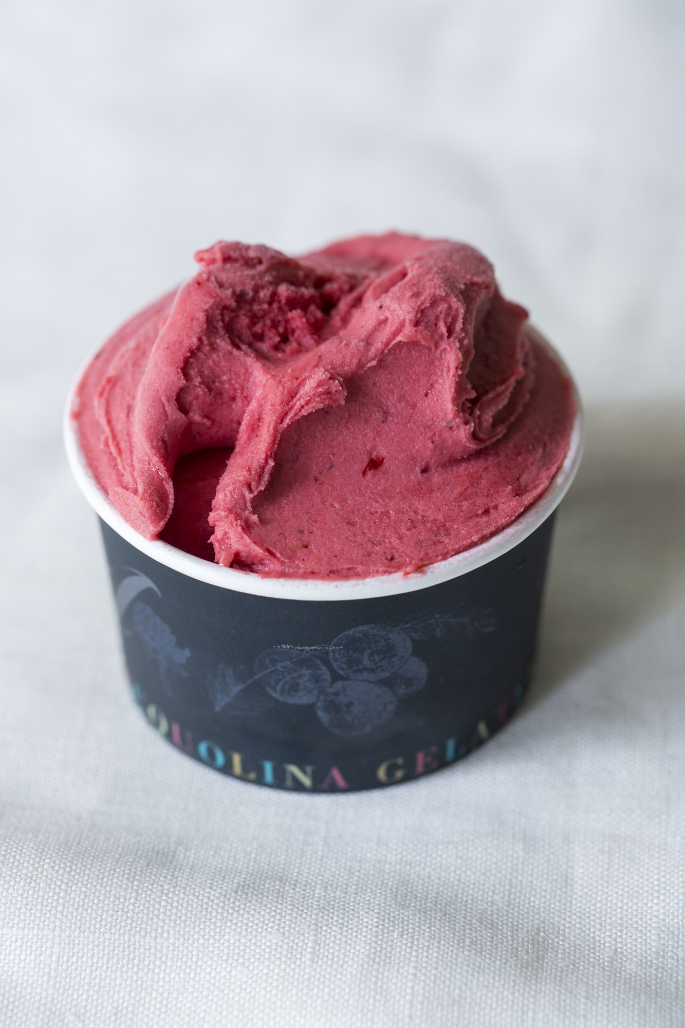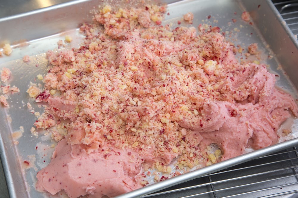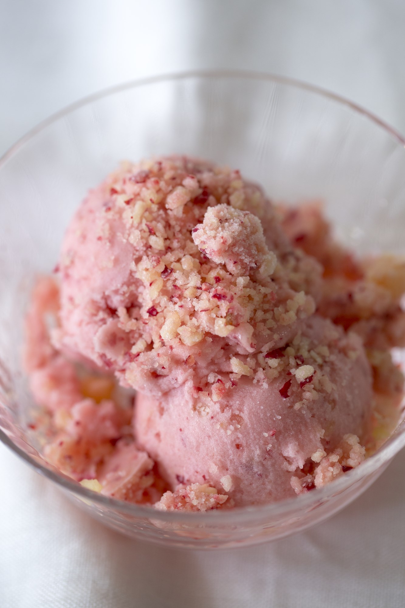 ねっとり滑らかなシャーベット状の中に凍った果肉の粒が現れる。ピンクが愛らしい、甘酸っぱい氷菓はジューシーなプラムを皮ごと、2通りの状態に加工。シンプルでも、上品な香り、酸味、そして食感の違いを楽しむ趣向だ。