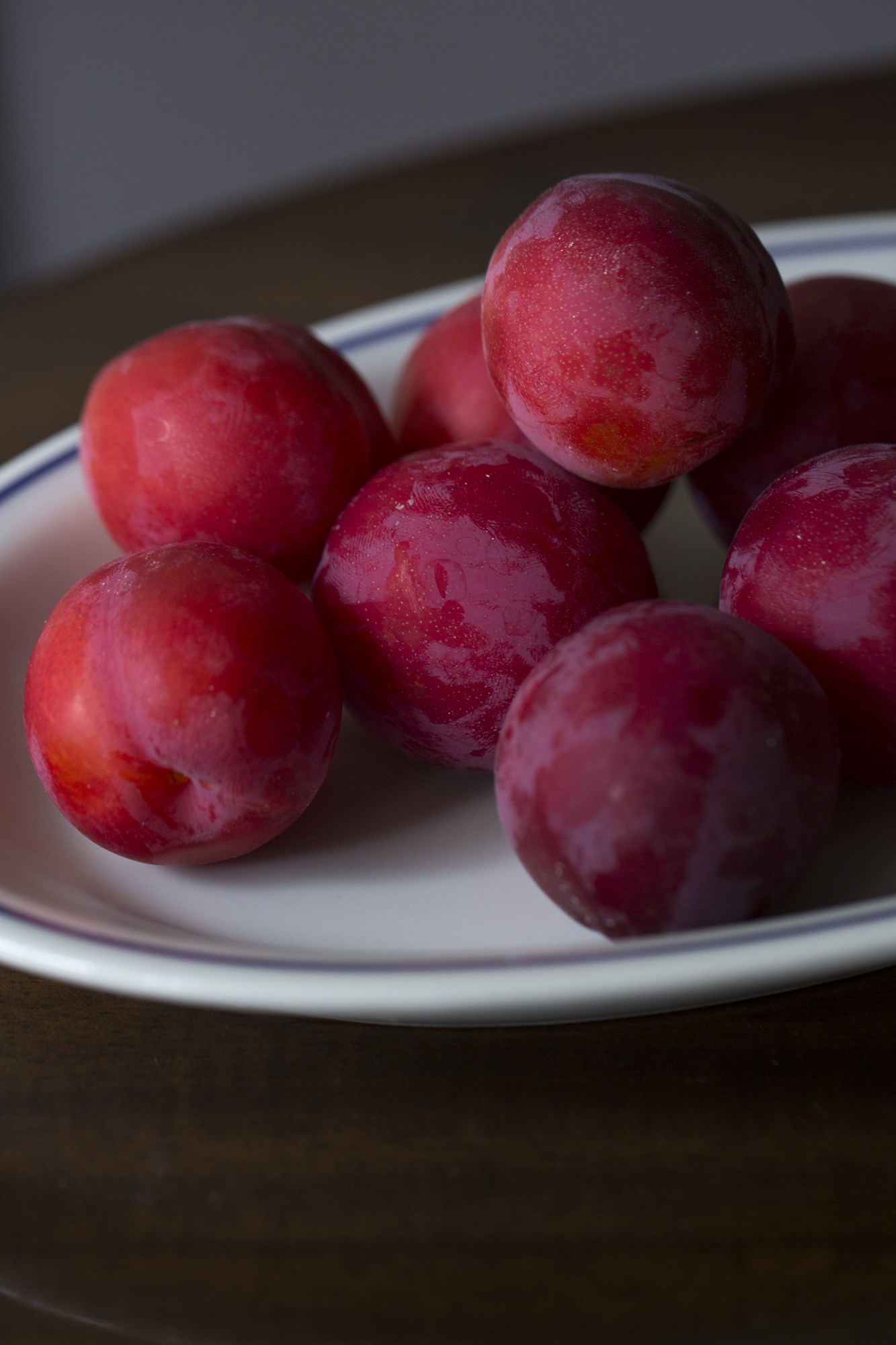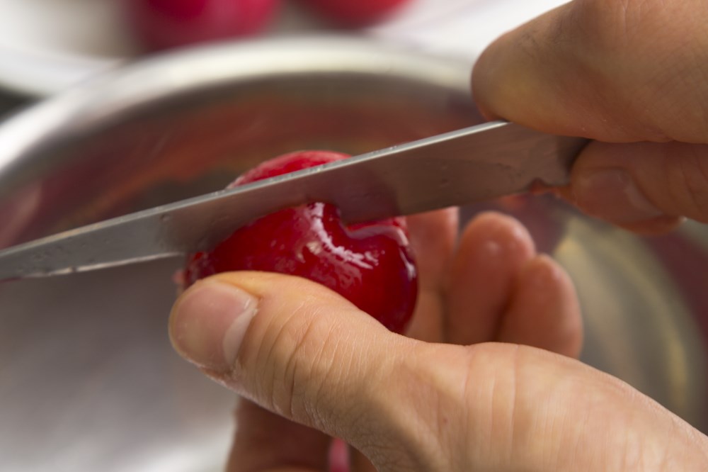 洗ったプラムをナイフで半分に割り、さらに半分に切れ目を入れて種を取る。果肉は