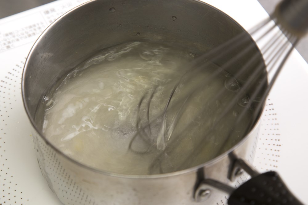 シロップを作る。鍋に水、グラニュー糖を入れて火にかける。砂糖が溶けたら火から下ろし、常温に冷ます。ハチミツを加える。