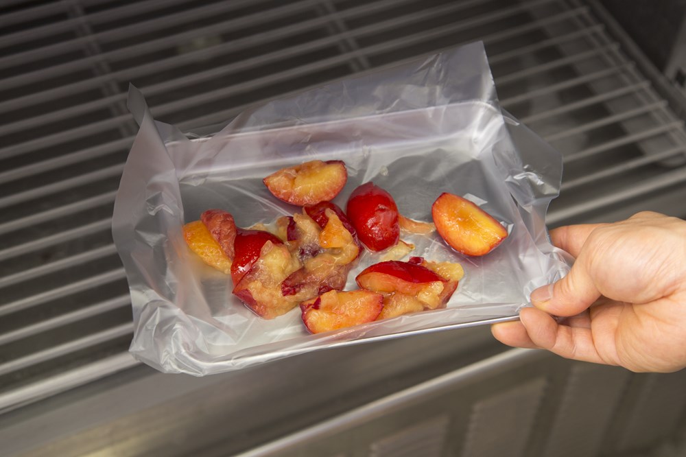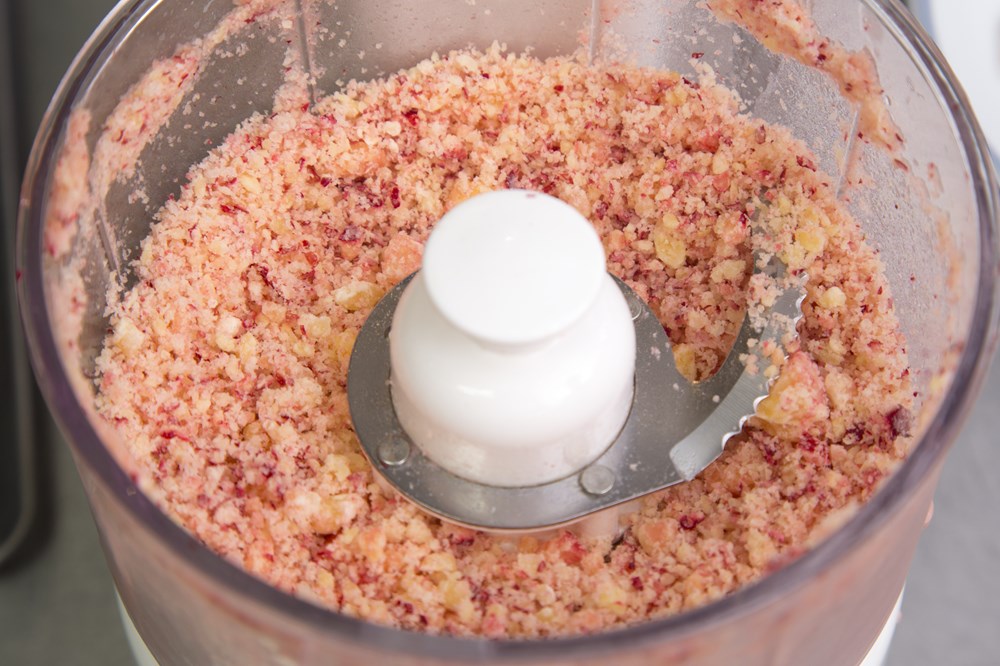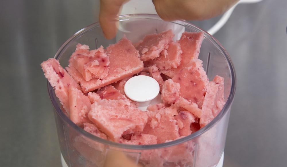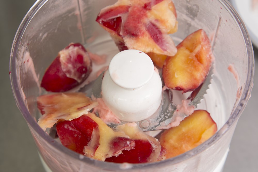 3の凍ったプラムをフードプロセッサーで粉砕し、細かい粒状にする。