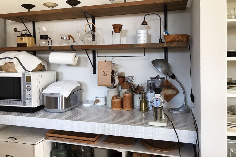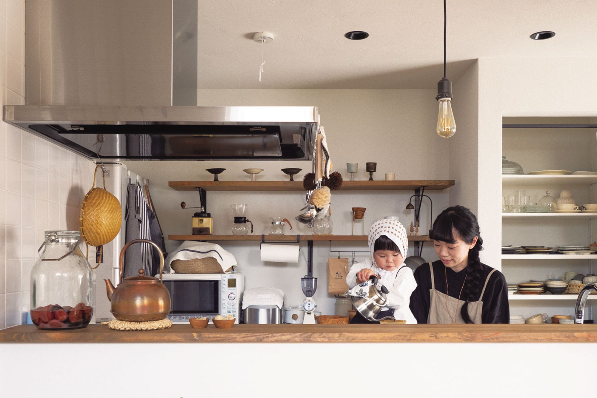 台所は暮らしの中心を占める大切な場所。使い手の数だけ、台所のありようがあり、その人の知恵と工夫が詰まっています。亀井きぬさんが暮らすのは、台所をメインにデザインして建てた家。脚立や椅子を駆使して、小さな子どもたちもコーヒーを淹れ、料理を楽しみます。