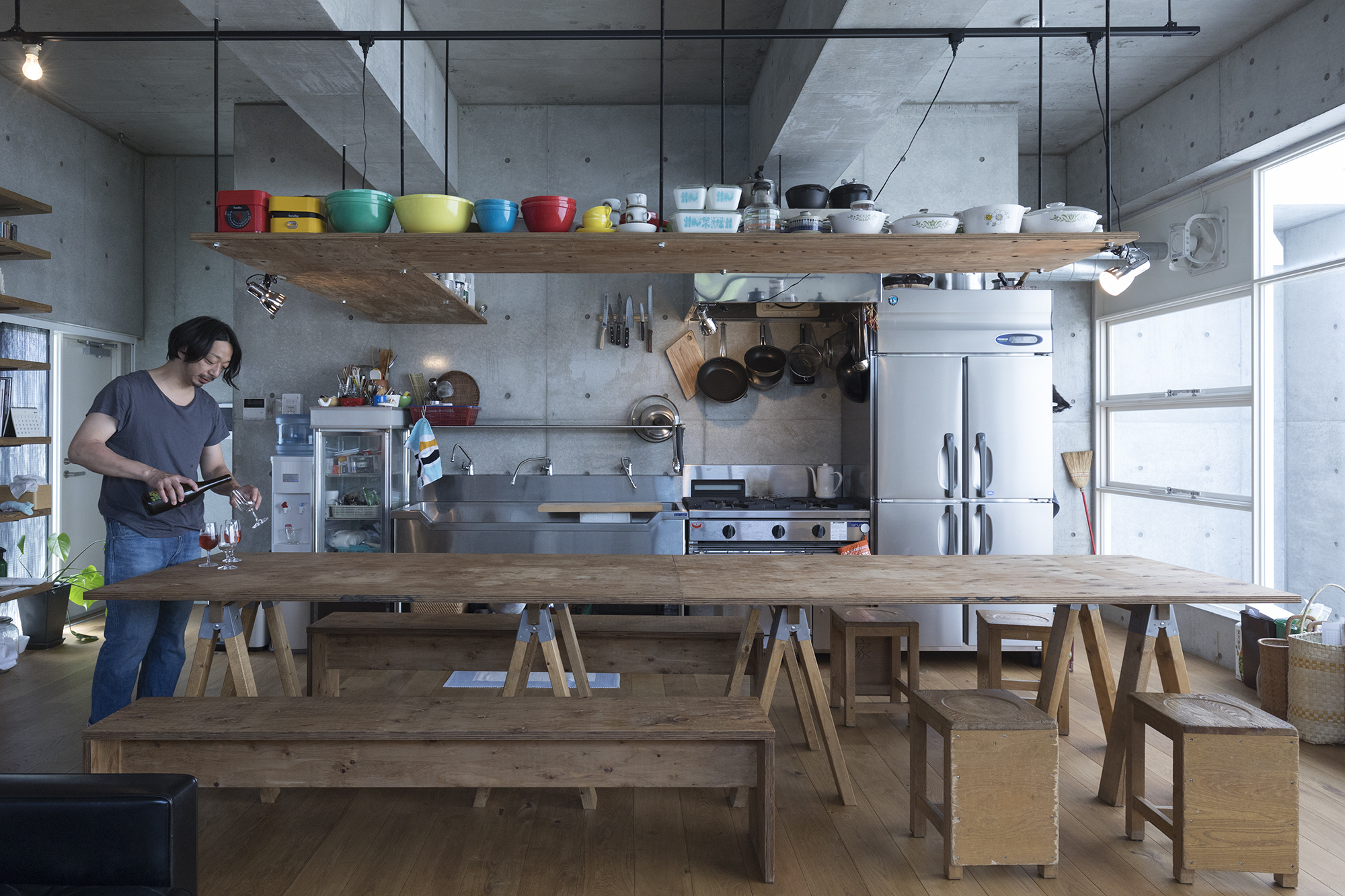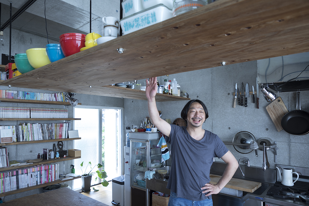 大勢の来客が集まる夜は、“戦うキッチン”に様変わりする。大量のグラスや食器の出し入れに、天井から吊るしたベニヤ板1枚のオープン棚がフル稼働。地震がきたら?と、つい心配になるヌケ感だが、「それを考えたら、面白くなくなっちゃう(笑)。落ちて割れるだけのこと。そもそも、モノを所有することに興味がないんです」