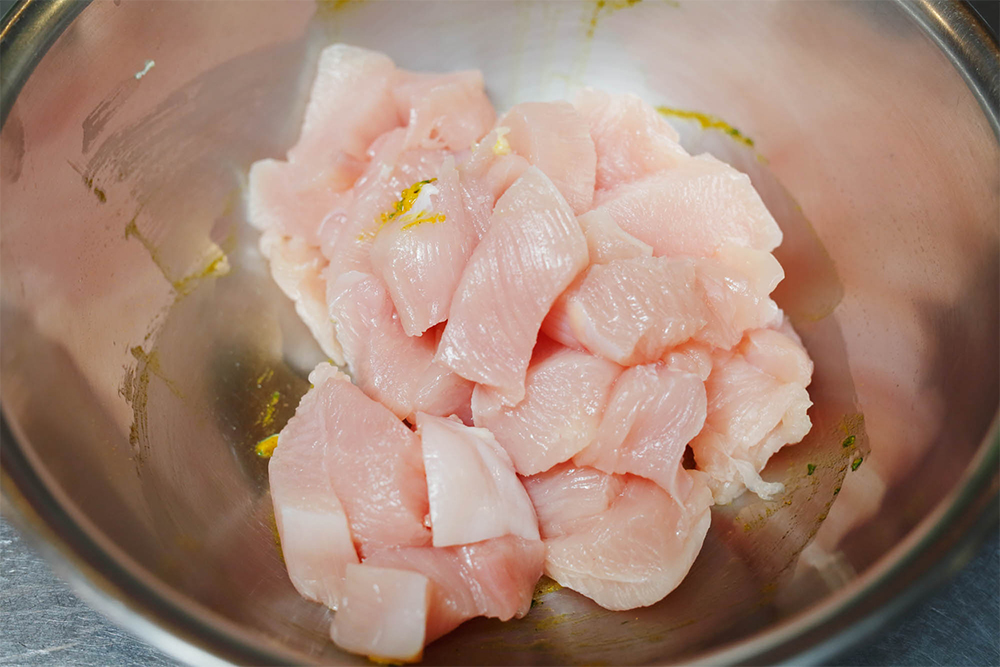鶏肉は皮と余分な脂を取り除き、2㎝角に切る。