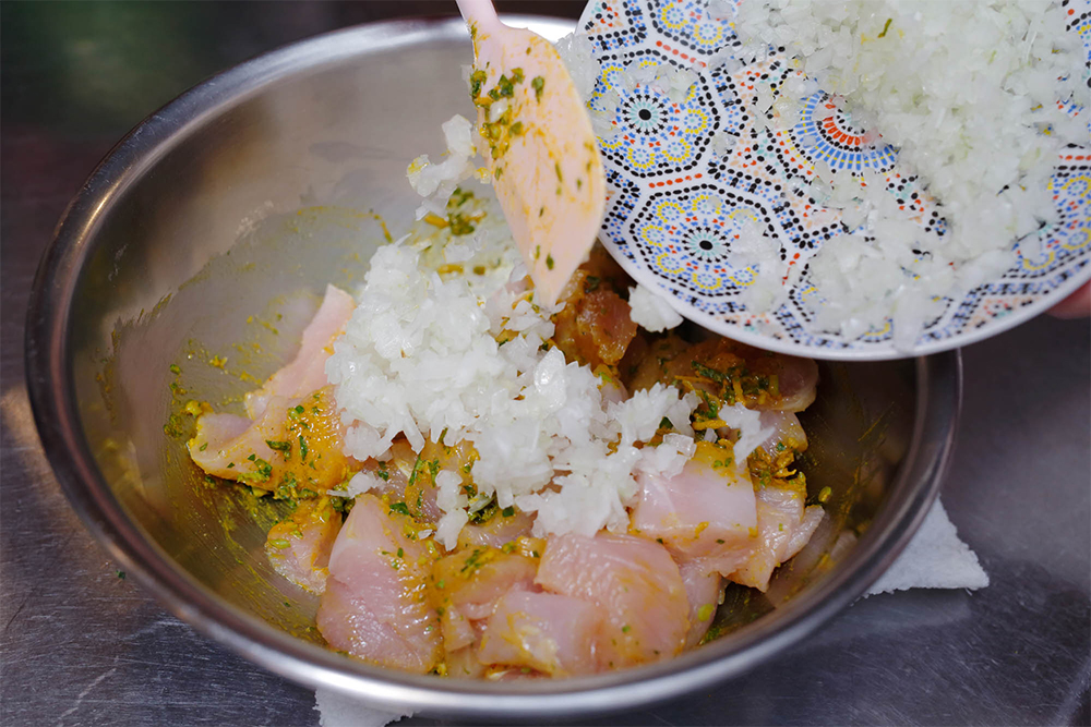 ボウルに入れ、シャルムーラ、タマネギを全体にまぶす。