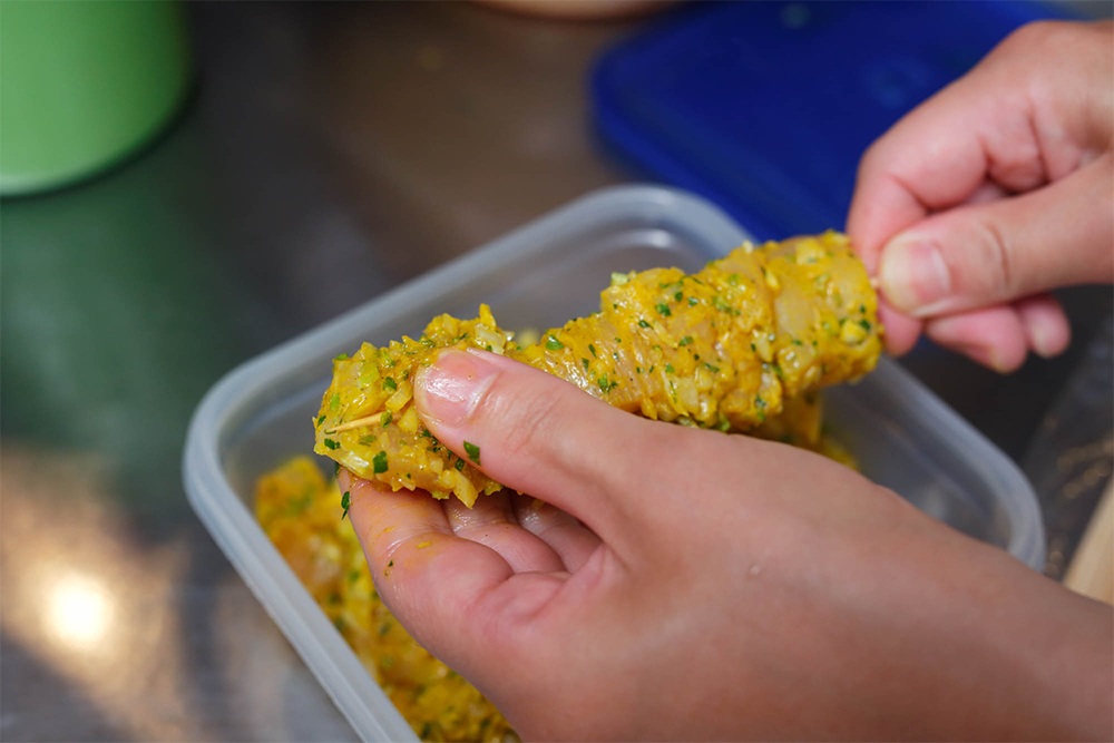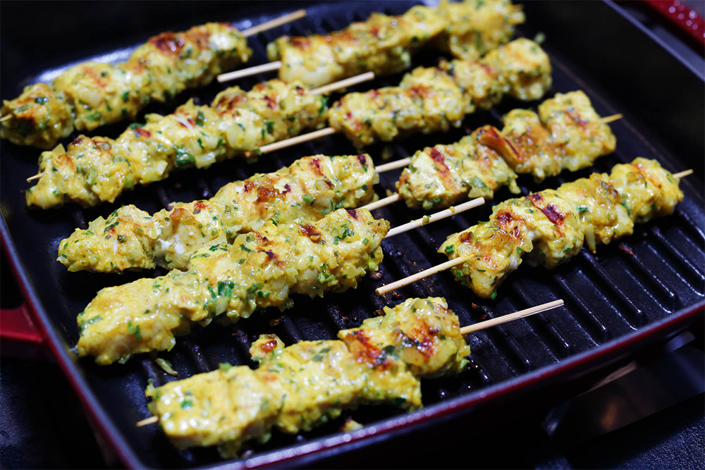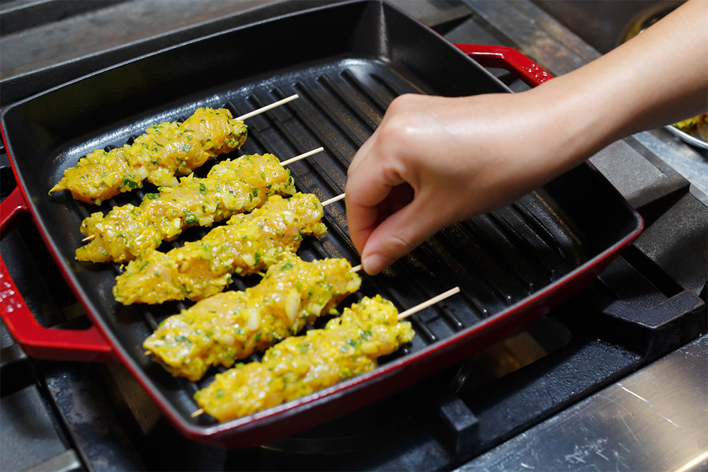 パサつきがちな鶏胸肉もマリネすることで、串焼きにしてもしっとり、やわらかに。グリルで焼くとハーブ&スパイスの香りが立ち上り、食欲をそそる。