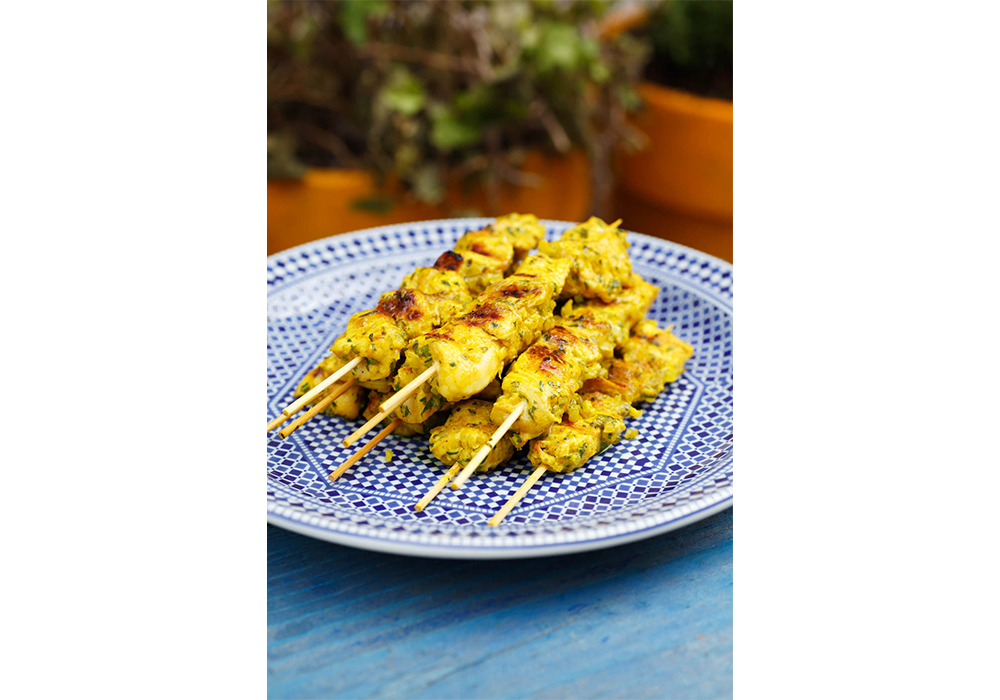 シャルムーラは、ハーブ、ニンニク、オリーブ油を基本に、肉の種類に合わせてスパイスを変える。鶏肉には、ジンジャーパウダーとターメリック、レモン汁を。「レモン汁が肉の保水性を高め、パサつきがちな胸肉がしっとり、やわらかに焼き上がります」。BBQで焼いた肉が硬くなるとお悩みなら、次回はマリネを試してみては。