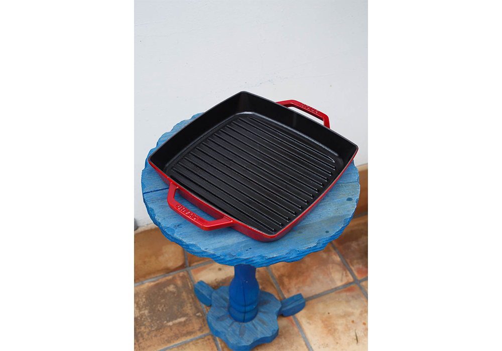 凹凸がある鋳物のグリルパンは、肉の余分な脂を溝に落としながら焼くことができ、熱伝導率もよく、直火に近い焼き上がりになる。