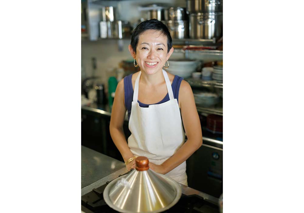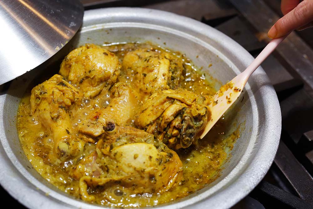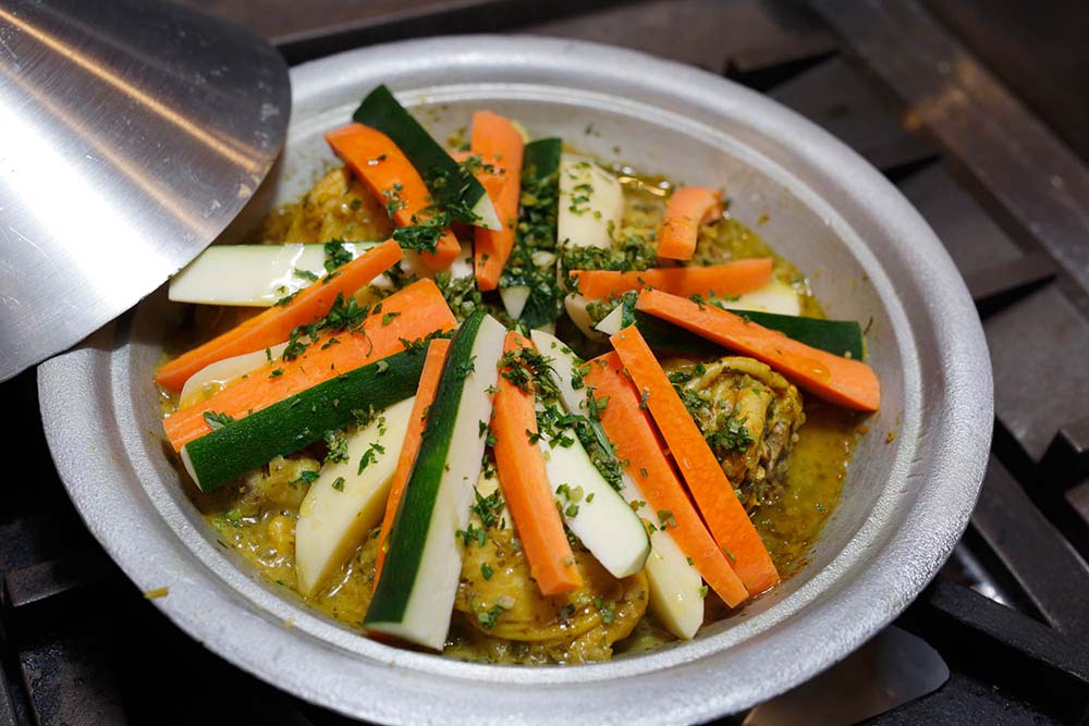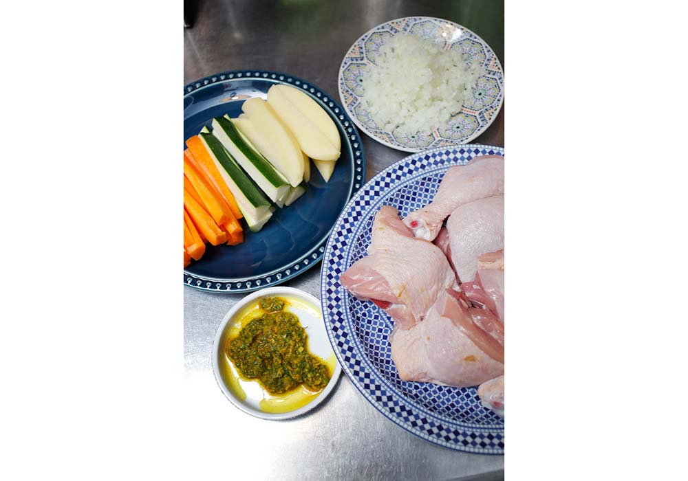 マリネソース、シャルムーラに漬けた鶏肉は、タジン鍋を使って蒸し煮にもできる。「モロッコ人のキャンプにタジン鍋は欠かせません。元々、タジンは炭火にかけて調理するもの。水を使わず、食材が持つ水分を引き出して蒸し煮にする、“無水調理”ができるタジン鍋は、屋外での料理に向いているのです」と小川歩美さん。