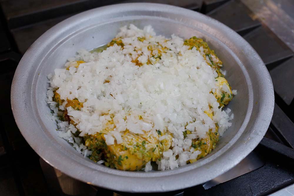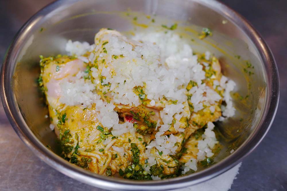 ボウルに鶏肉、シャルムーラ、タマネギ100gを加えて全体にまぶす。