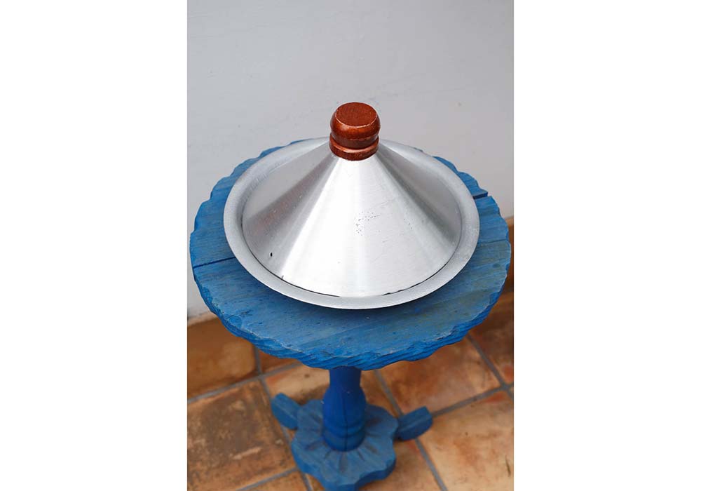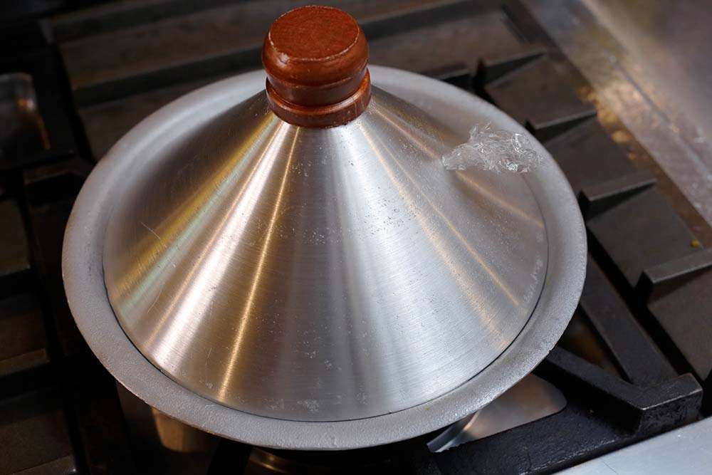 モロッコなど北アフリカで使われる鍋。三角の蓋を被せて火にかけることで、水を加えず、食材の水分を引き出して調理ができる。