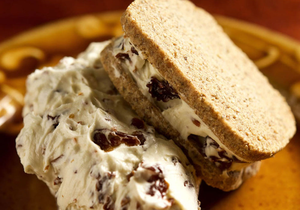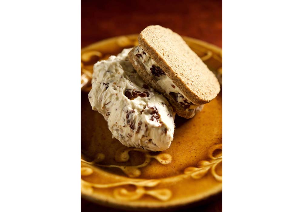[7]ライ麦のクッキーで挟んで盛り付ける。冷蔵庫で1週間程度保存できる。