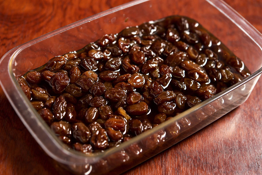 [1] 容器にレーズンを入れ、熟成酒を注ぐ。常温で一晩置く。