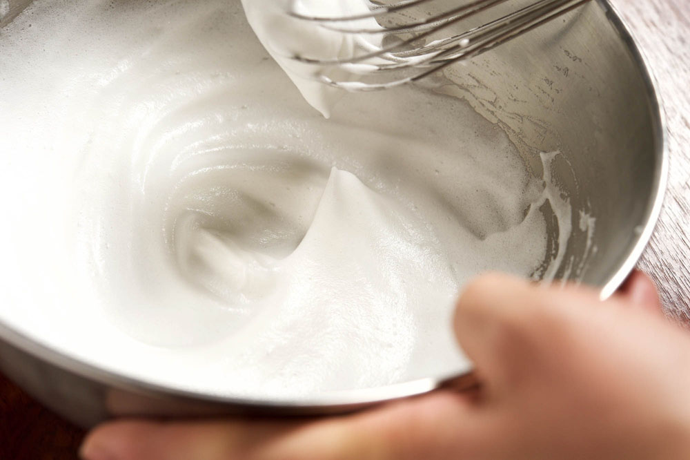 [3] ボウルに卵白と上白糖の半量を入れ、泡立て器で十分立てのメレンゲを作る。