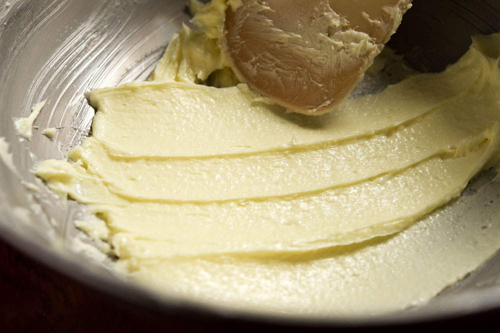 [4] 別のボウルに常温に戻したバターを入れ、滑らかなクリーム状になるまでゴムベラでよく練り、残りの砂糖を加え、よく混ぜる。