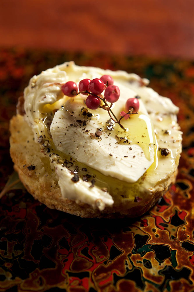 アメリカンビスケットにレーズンバタークリームを薄く塗り、1カ月塩漬けにしたリコッタチーズをのせ、オリーブ油とピンクペッパーで風味付けした。さらに塩気が加わり、おつまみ感がUP。