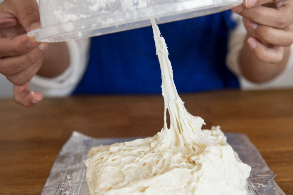 冷蔵庫で発酵させるメリットは時間に拘束されない上、ゆっくり発酵が進むことで小麦粉のでんぷん質が糖化し、イーストの角がとれて味に丸みが出るという。1日1回スプーンで軽く混ぜて過発酵を防げば、5日間「作り置き」が可能だ。