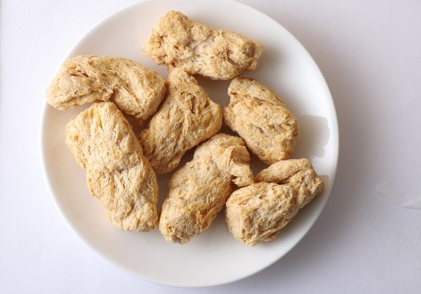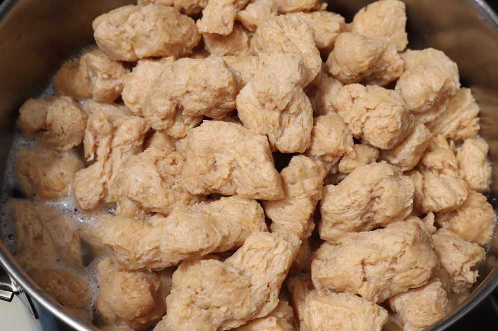 大豆ミートは、水に2時間浸けて戻し、よく水気を絞って調理へ。強く触ると崩れやすいので優しく扱う。