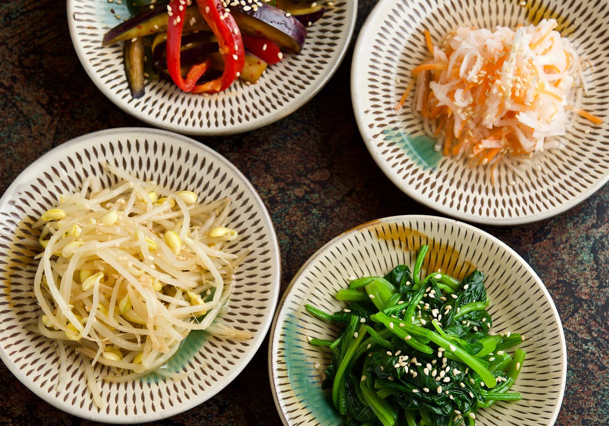 ナムルとは、野菜や山菜に味付けをした料理の総称。韓国の食卓には欠かせない副菜で、キムチなどと一緒に、数種類のナムルが出されます。ナムルは野菜のだしに浸けた、つゆだくのお浸し。だから、昔は冷めたご飯におかずとナムルをかけて、その汁でご飯をほぐして食べていたんですよ。
