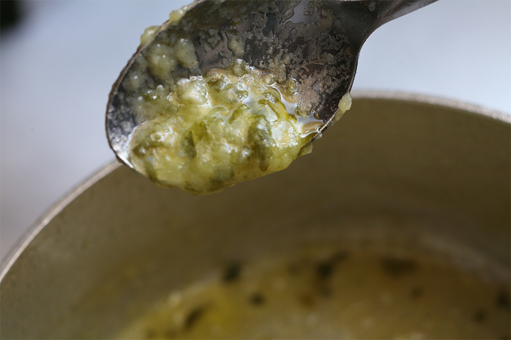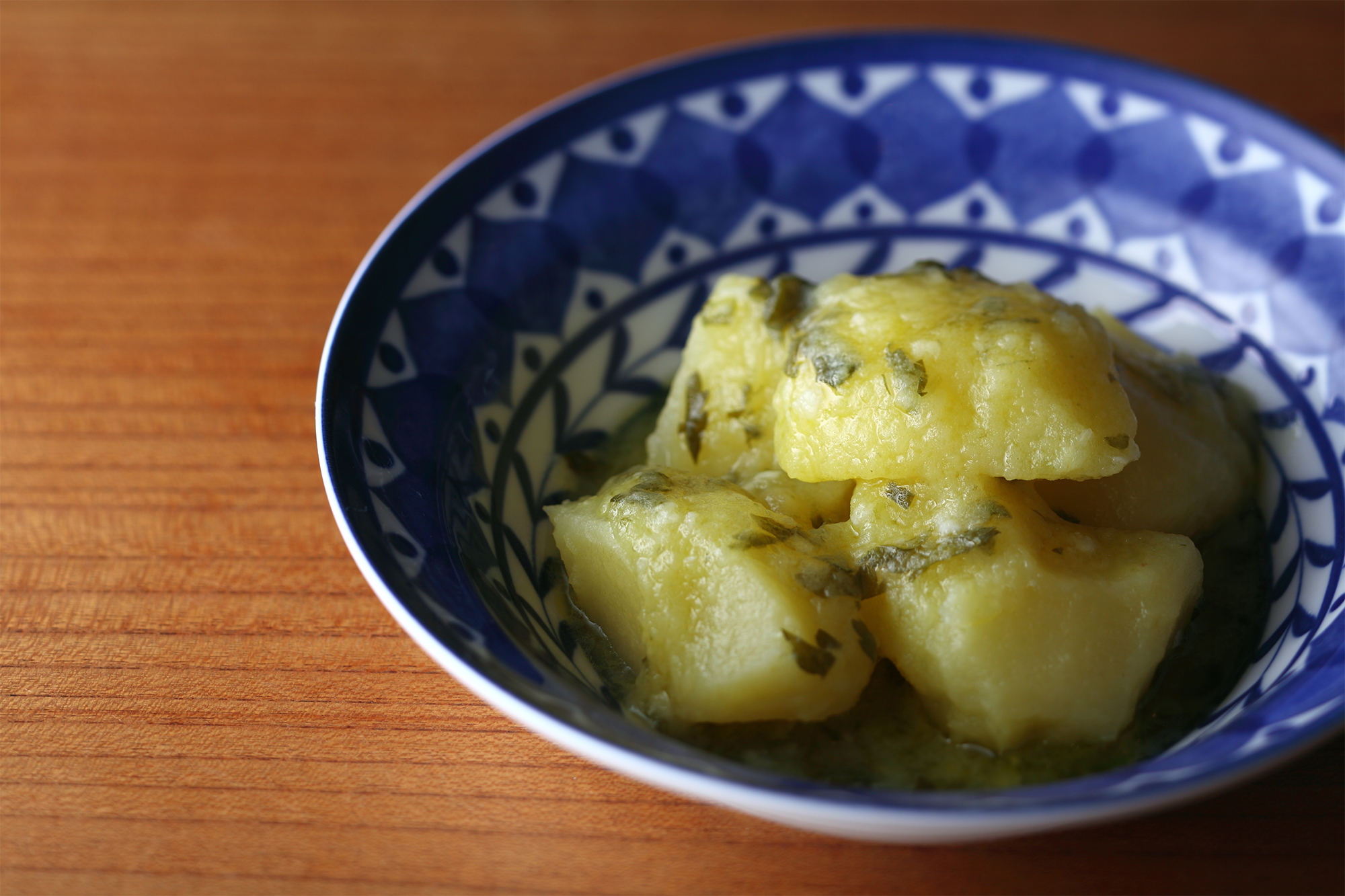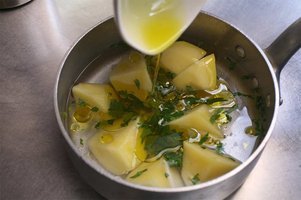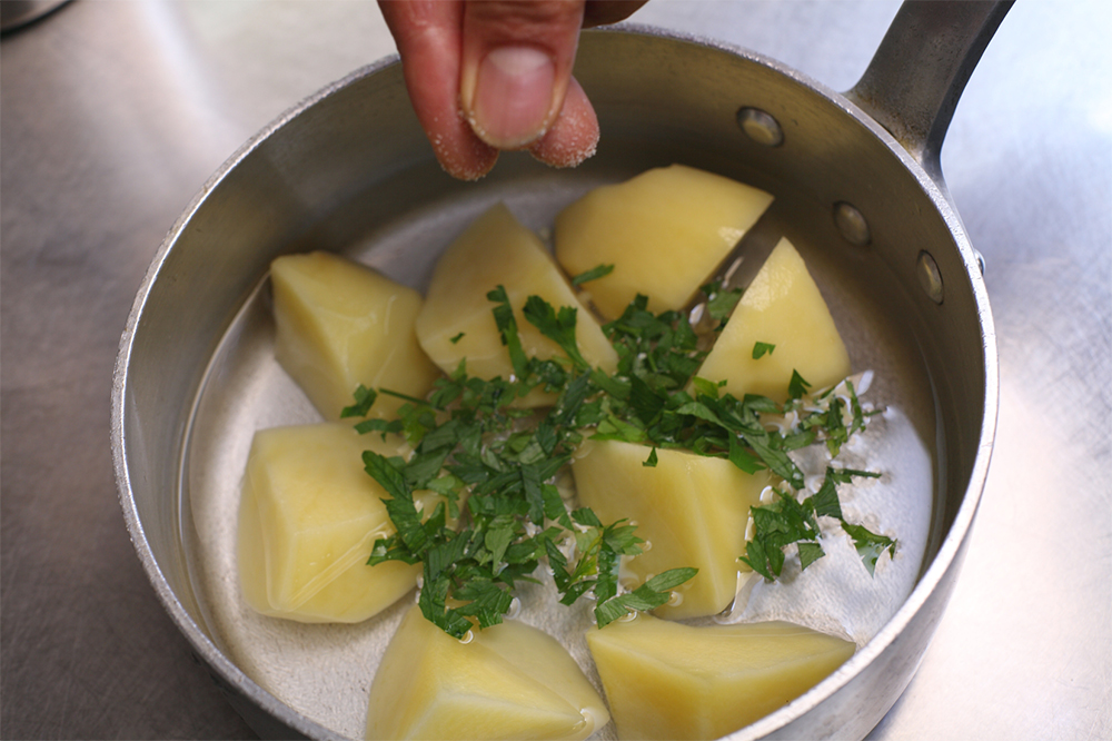 ジャガイモを茹でる際、ニンニクと塩の他に、オリーブ油とイタリアンパセリを加えて火にかけるだけ。ミラッツォのレストランで、まかないや付け合わせによく登場した「パターテ・プレッツェモラーテ」という料理です。“キモ”はもちろん、オリーブ油。茹で汁に一緒に加えることで、ジャガイモがオリーブ油の甘味や旨味を吸って、塩味はまろやかに、こっくりとした仕上がりになります。