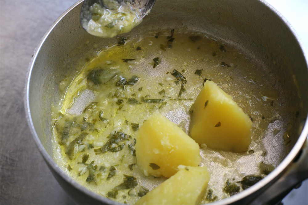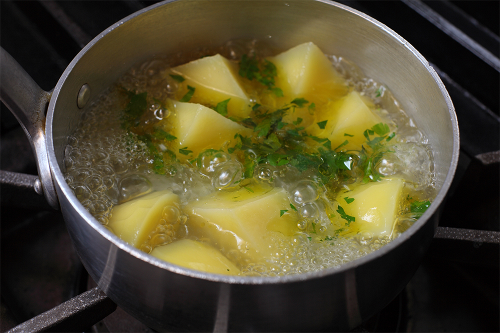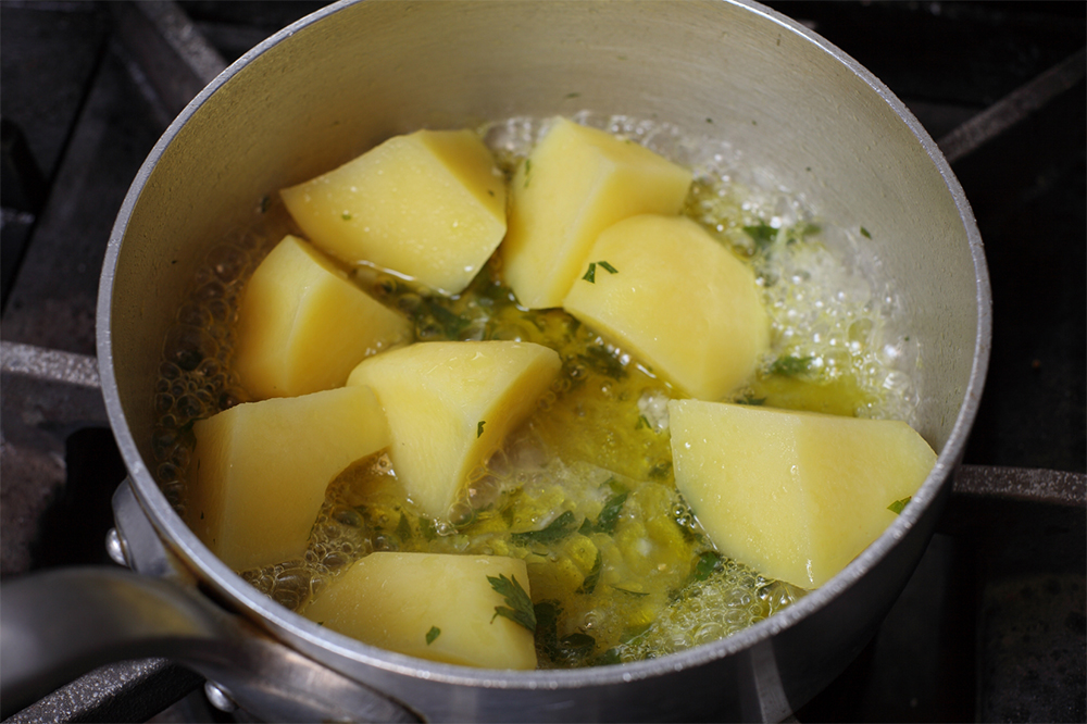 オリーブ油を加えてジャガイモを茹でる「パターテ・プレッツェ モラーテ」