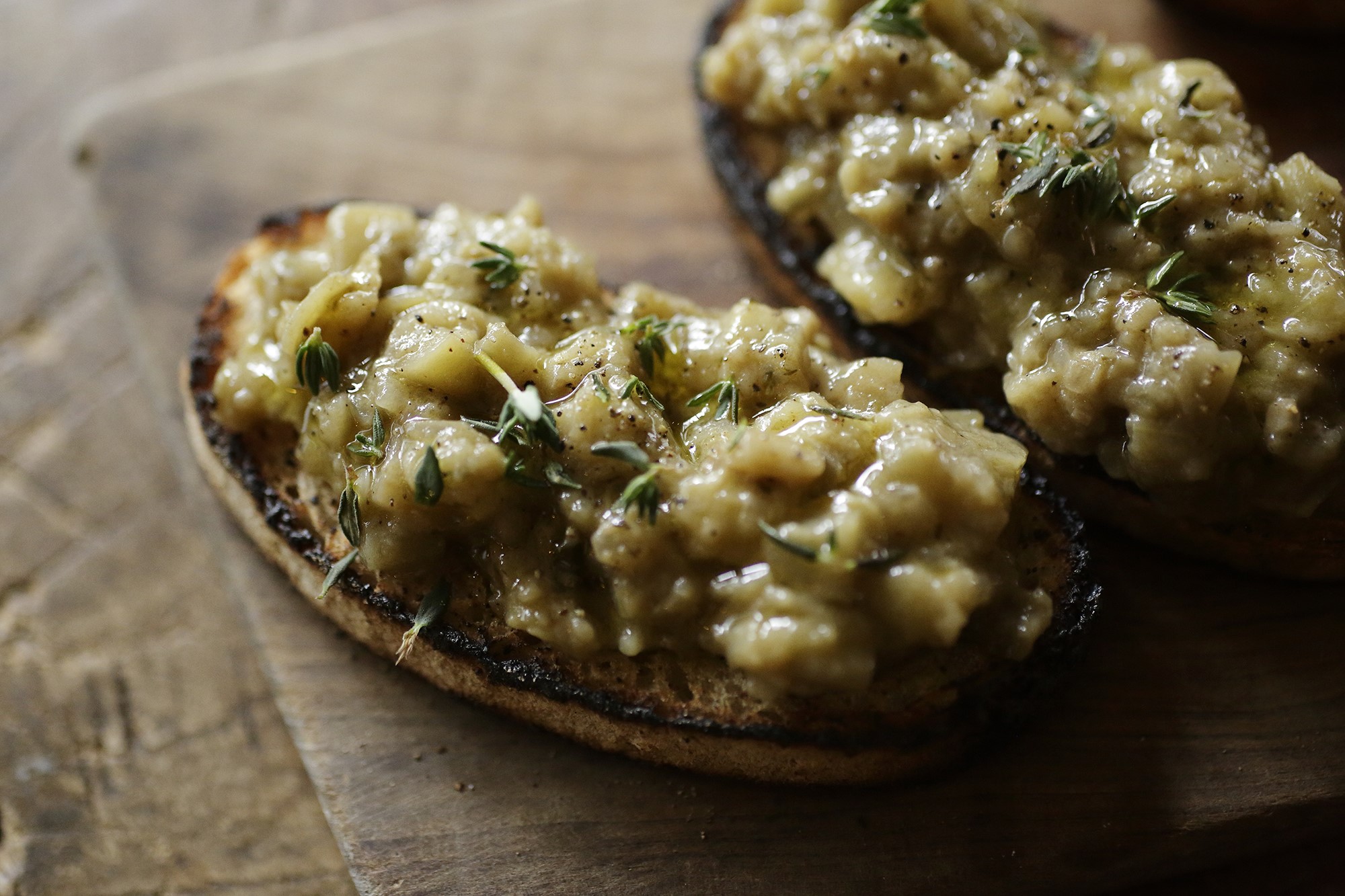 ナスと刻んだアンチョビー、塩、タイム、黒コショウの順に加え、全体をヘラで混ぜる。