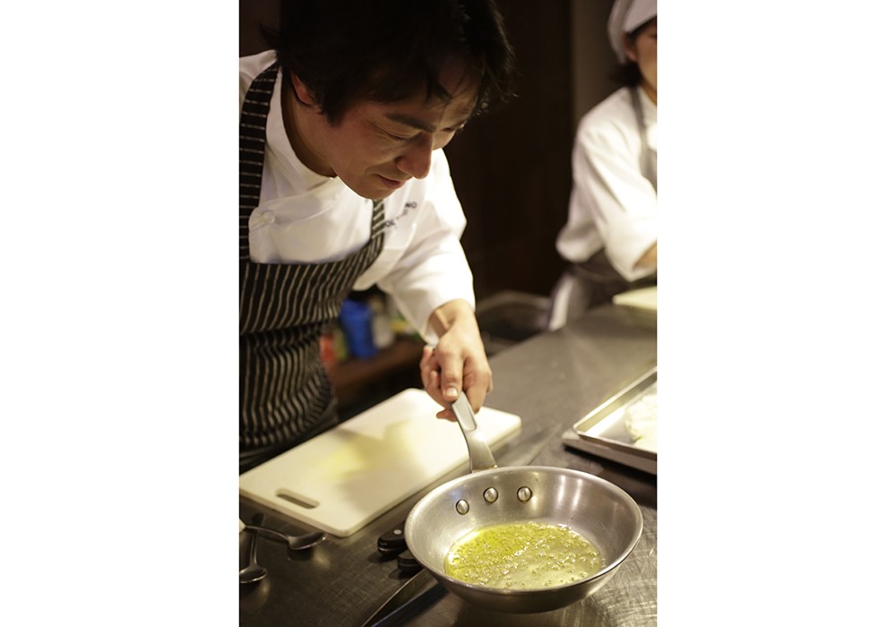 ニンニクは常温のオリーブ油に入れてから火を付け、弱火でじわじわ、じわじわと甘味を出していきます。熱い油には決して入れません。なぜ、弱火か。これはニンニクが温まり始めて、ガーリック臭が出るまでの間に、僕たちの欲しい「甘いゾーン」があるからです。この甘いゾーンは、強火で性急に火を入れても決して現れません。ゆっくりじっくり温めた後に初めて現れるものです。ちょうど、水に昆布を入れ、昆布本来の旨味をじっくり引き出してから料理するのと同じ。鰹節のように華やかな香りはしないけれど、ないと味が決まらない。そんな、大事な味のベースとなるものです。イタリアのニンニクの使い方は、まさに日本の昆布の使い方と同じだと思います。