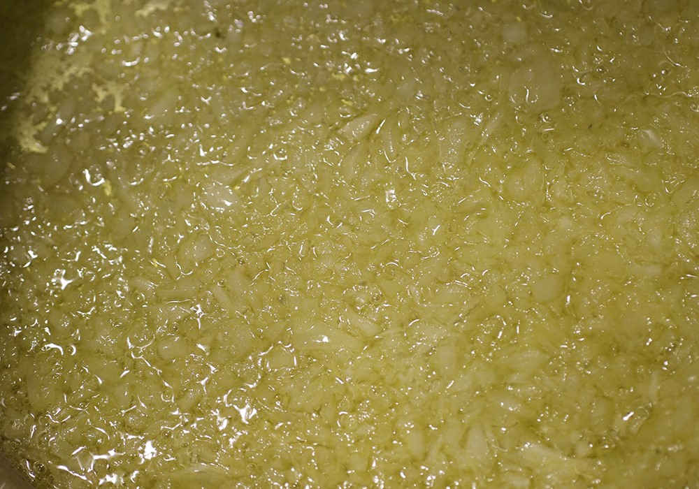 ニンニクの旨味を引き出したら、タマネギを加えて弱火でじっくり甘味を引き出す。