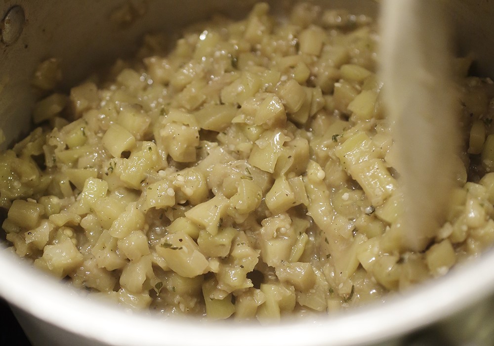 「ペスト・ディ・メランザーネ(ナスのペースト)」では先に旨味のベースを香味野菜で作り、そこに別の野菜を合わせて一緒に煮込みます。すると、味に奥行きが生まれます。ニンニクやタマネギの旨味も料理と一体化するよう、両方みじん切りにします。みじん切りの野菜を焦がさないよう、ゆっくり甘味を引き出すのは根気のいる作業ですが、待った甲斐のある味になります。