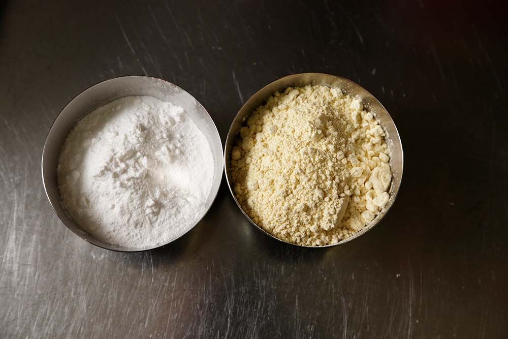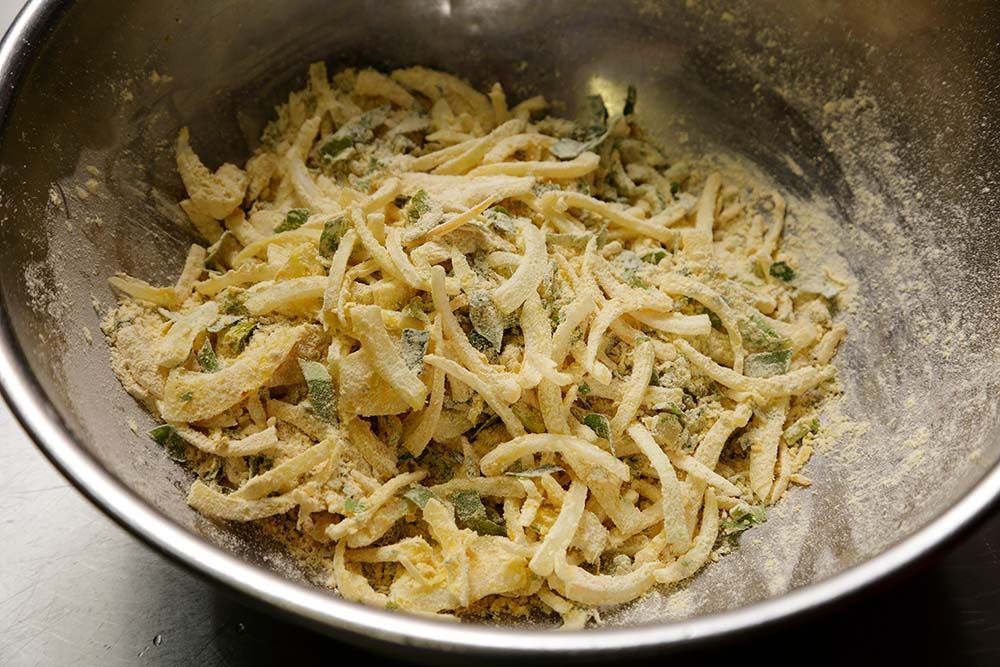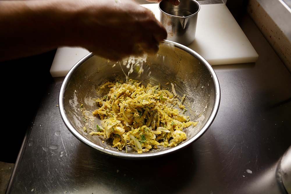 ヒヨコ豆の粉100%で作るとやや重く硬い食感になるのに対し、米粉をブレンドすることで、サクッとクリスピーに仕上がる。ほのかな豆の風味と食感が野菜のかき揚げに食べ応えを与える。