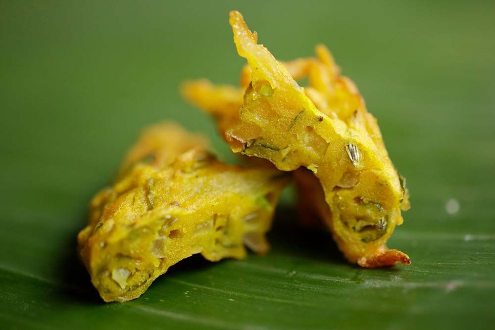 シェフのトーマスさんが南インド・チェンナイの五ツ星ホテルで働いていた時のレシピをベースに、ヒヨコ豆の粉に米粉を合わせてクリスピーに。やっとタマネギがまとまるくらいの薄衣で高温の油に投入すると、スパイスの香りが一気に花開き、シンプルな野菜のかき揚げに奥行きが生まれる。野菜の揚げものは塩味を感じやすいので、塩はスパイスを引き立てる程度に控えめに。スパイスの組み合わせや配合に個性が表れるのも、パコラの醍醐味だ。