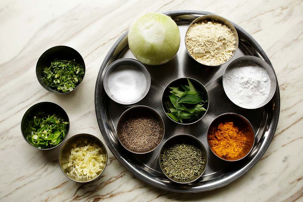 日本で粉といえば小麦粉が一般的だが、南インドの家庭ではヒヨコ豆を挽いた粉“ベサン”が必需品。きな粉のように焙煎していないので香りは穏やか、ほのかに豆の風味を感じる優しい味わいだ。このヒヨコ豆の粉とスパイスを水で溶いた衣で、主に野菜や肉、魚、チーズを揚げたものが「パコラ」。インド風天ぷらともいわれ、2019年5月にオープンした南インド料理店「三燈舎」のオニオン・パコラは、まるでかき揚げのようなビジュアルで登場する。