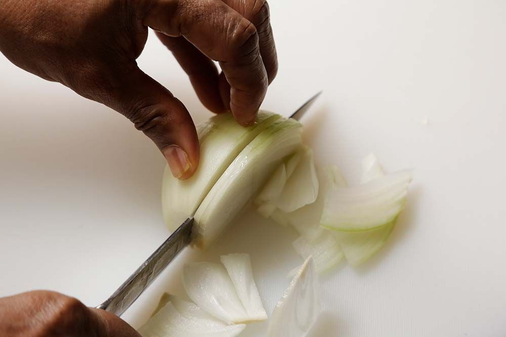 タマネギは縦半分に割り、繊維に垂直に2等分してから、繊維に沿ってやや厚めにスライスする。