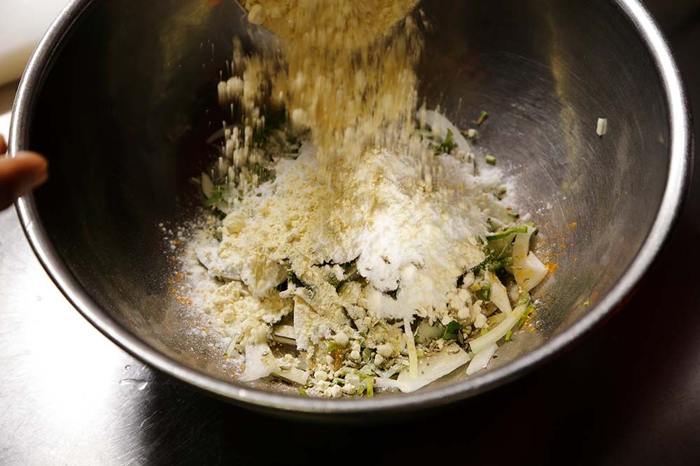1 衣は、ヒヨコ豆粉と米粉をブレンド