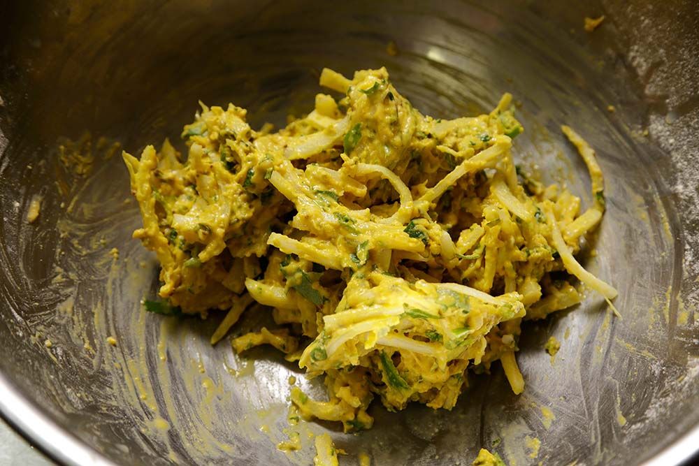 タマネギを加えて両手で上下を返し、まんべんなく粉をまとわせる。
