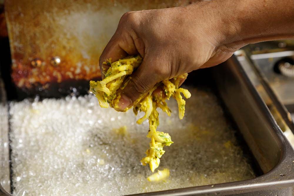 POINT:ぽってりと衣をまとったパコラもあるが、トーマスシェフのパコラは薄衣でかき揚げのようなサクサク感が身上。油の中で衣同士がくっつかないよう、網杓子を油に突き刺しながら高温短時間で一気に揚げ切る。