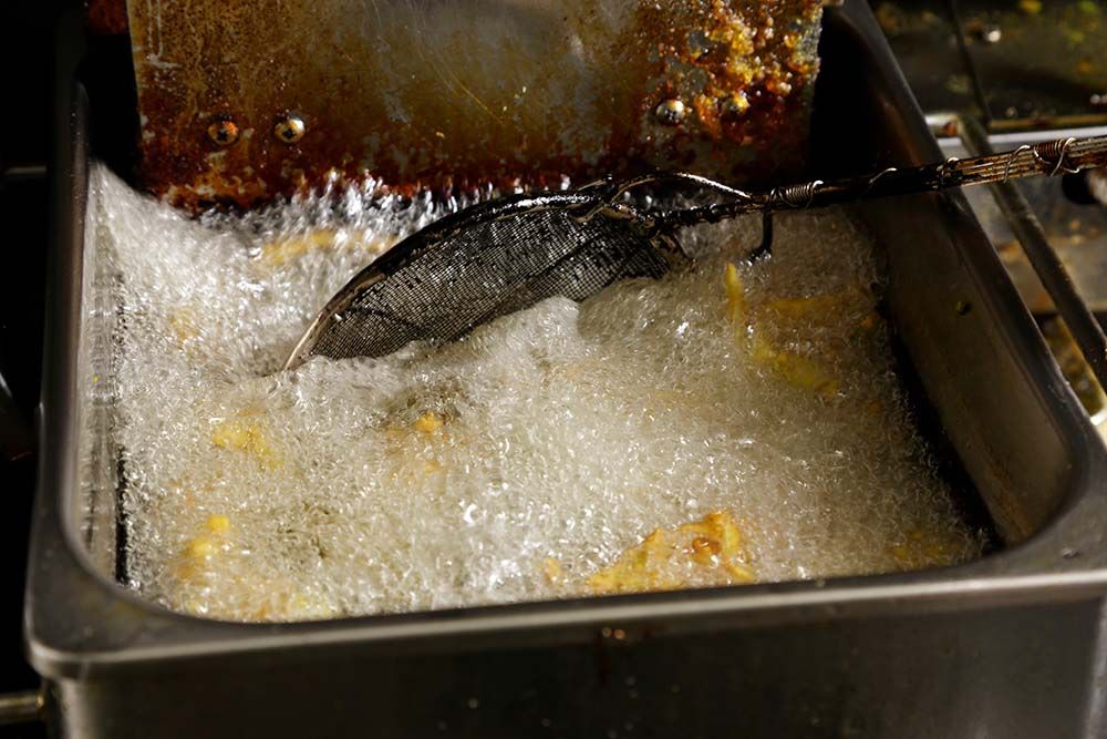 薄衣なのであっという間に火が通る。網杓子ですくって油を切り、すぐ皿に盛り付ける。