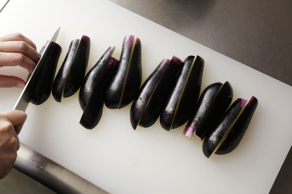 ナスは洗ってヘタを取り、縦に4等分する。太い場合は6等分に。