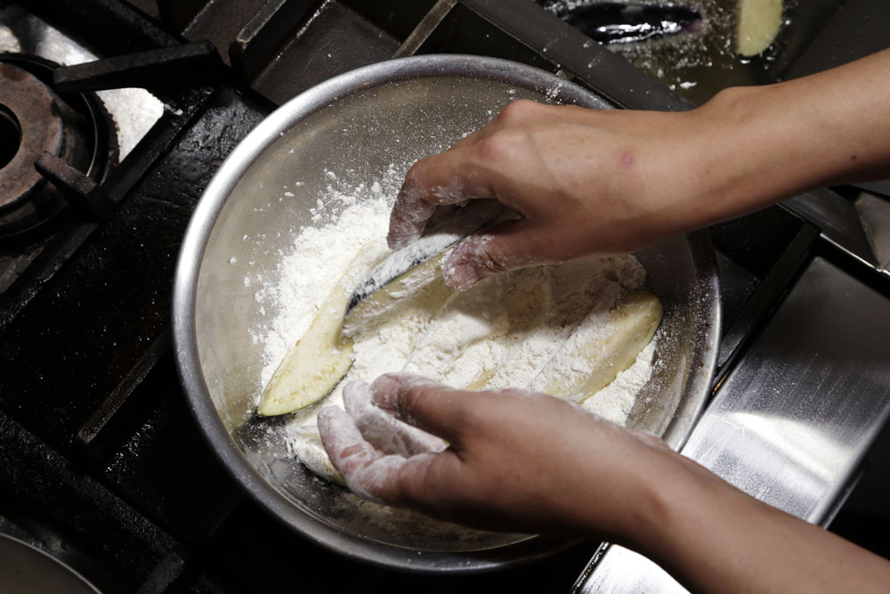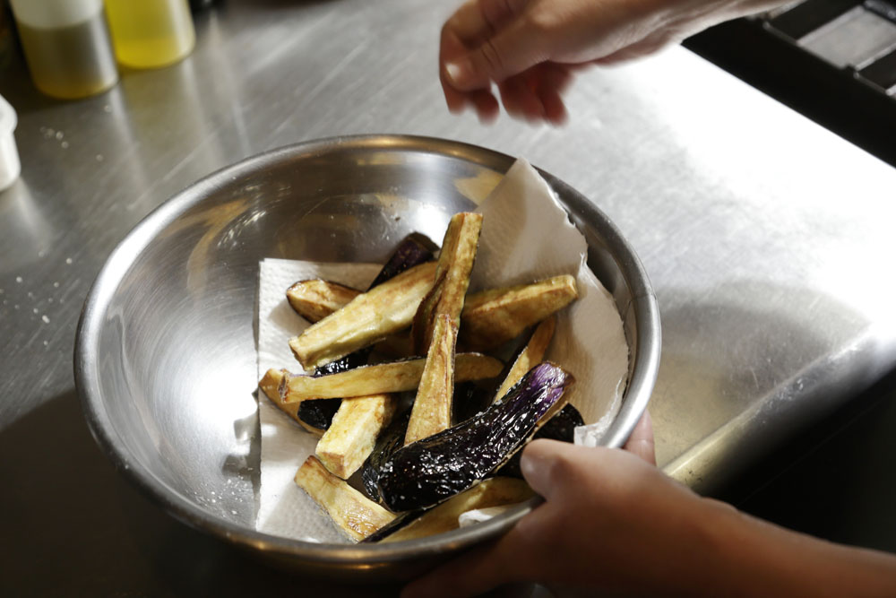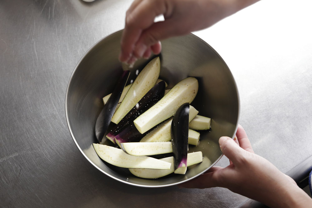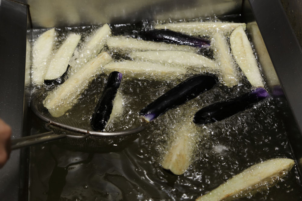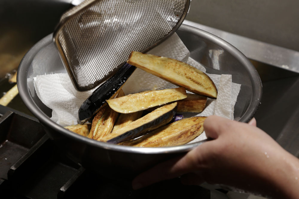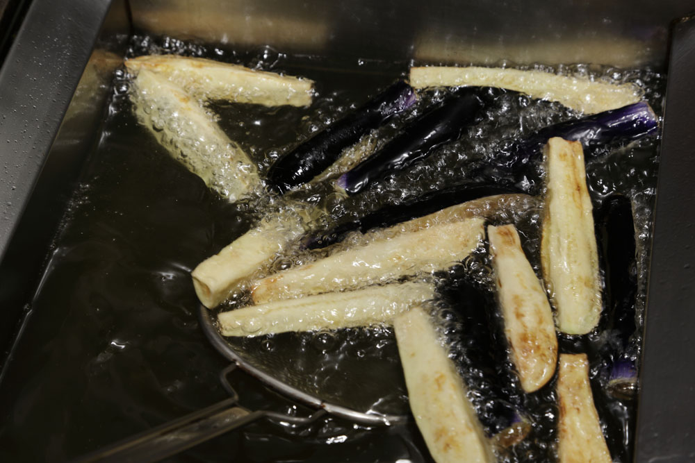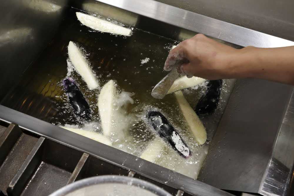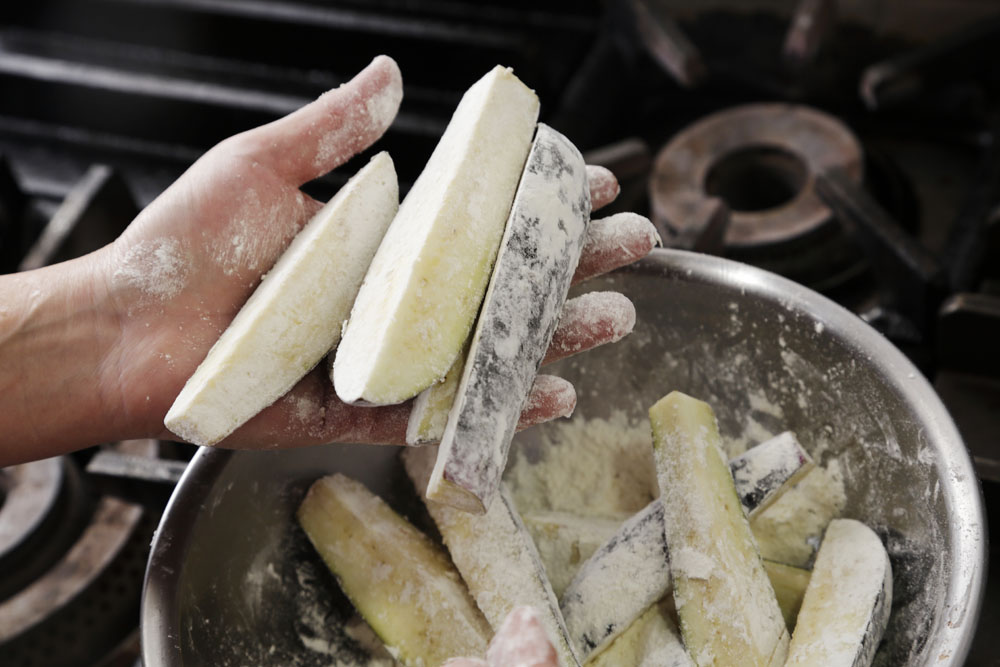 ナスを揚げる際のコツは2つ。1つは薄く粉をまぶすこと。「ナスを素揚げにすると、中の水分が抜けて油っこくなりやすいんです。断面を粉でコーティングするだけで、ジュワッとジューシーに揚がります」