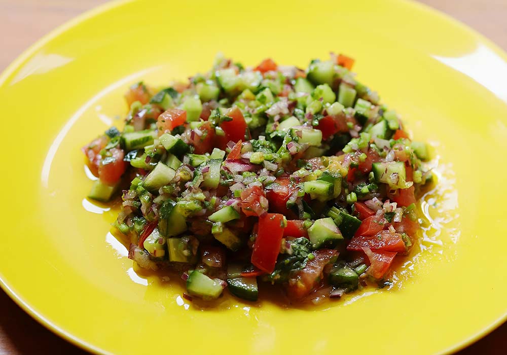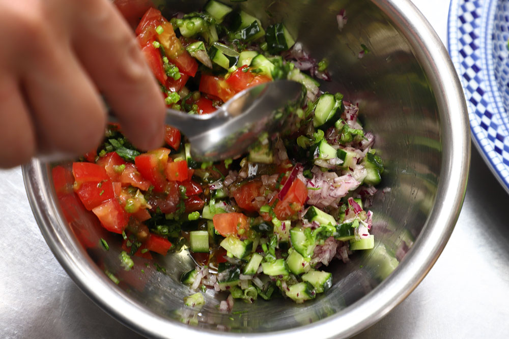 モロッコ人は食卓にサラダを欠かしません。トマト、キュウリ、ナス、ピーマン、サツマイモなど、季節の野菜を組み合わせたサラダを一年中食べるんです。その中でも、これはモロッコで一番スタンダードなサラダ。刻んだ野菜を、オリーブ油とレモン汁、塩、コショウと少しのクミンで和えただけのシンプルな構成ですが、食材それぞれの食感のコントラストや味わいの変化に富んでいて、食べ飽きないおいしさです。