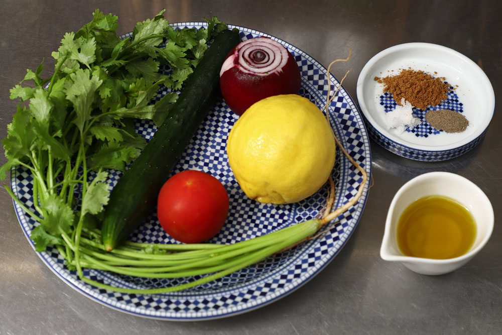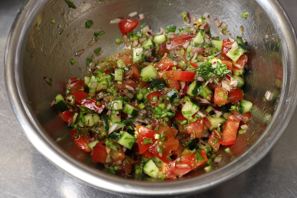 均一に刻まれたキュウリとトマト、赤タマネギのザクザク食感が小気味よい。香菜の爽やかさと酸味の中に、クミンの余韻がほんのり残る。