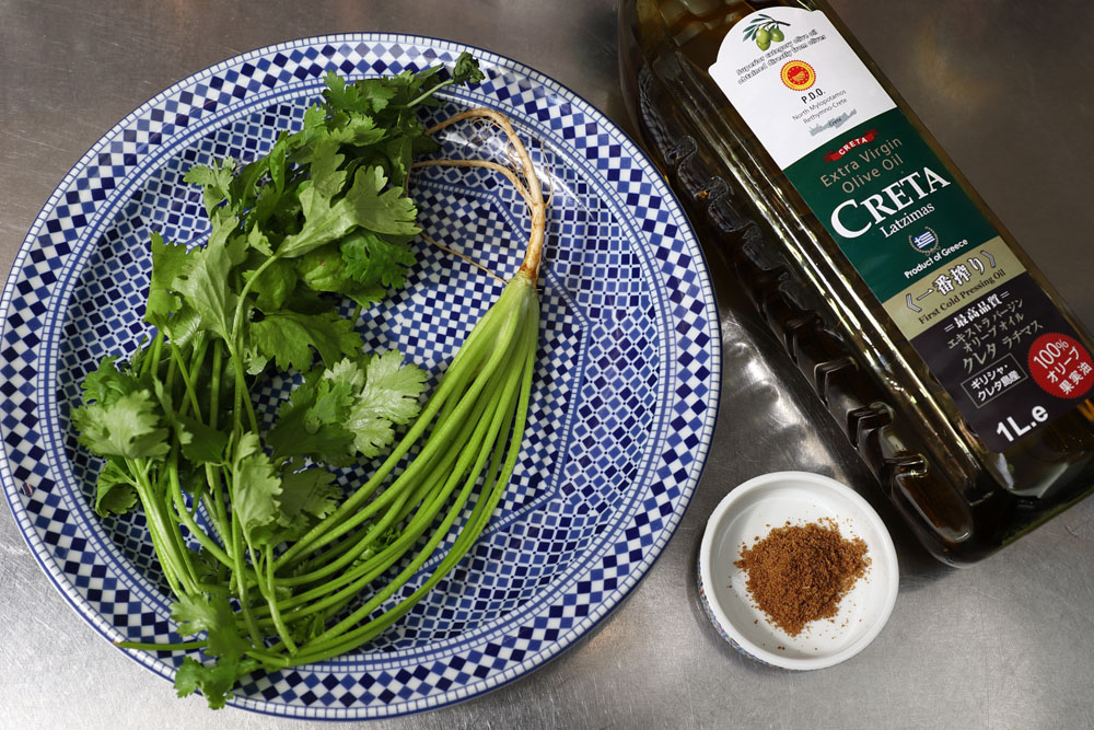 モロッコらしい味わいは、フレッシュな香菜にクミン少量、E.V.オリーブ油で作る。クミンは、全体がクミン味に染まらないよう少なめのさじ加減でバランスを取るのがモロッコの料理上手の条件。小川さんは現地の味に近い、味の濃いギリシャ産のオリーブ油を選ぶ。