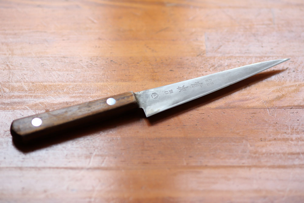 20年近く愛用している「有次」の合金鋼包丁。研ぎ続けて、小回りの利くサイズになった。「同じ型のステンレス製を使ったこともありましたが、やはり鋼の方が切れ味がいいので、2本持ちで毎日使っています。トマトが切りにくくなってきたら研ぎ時」