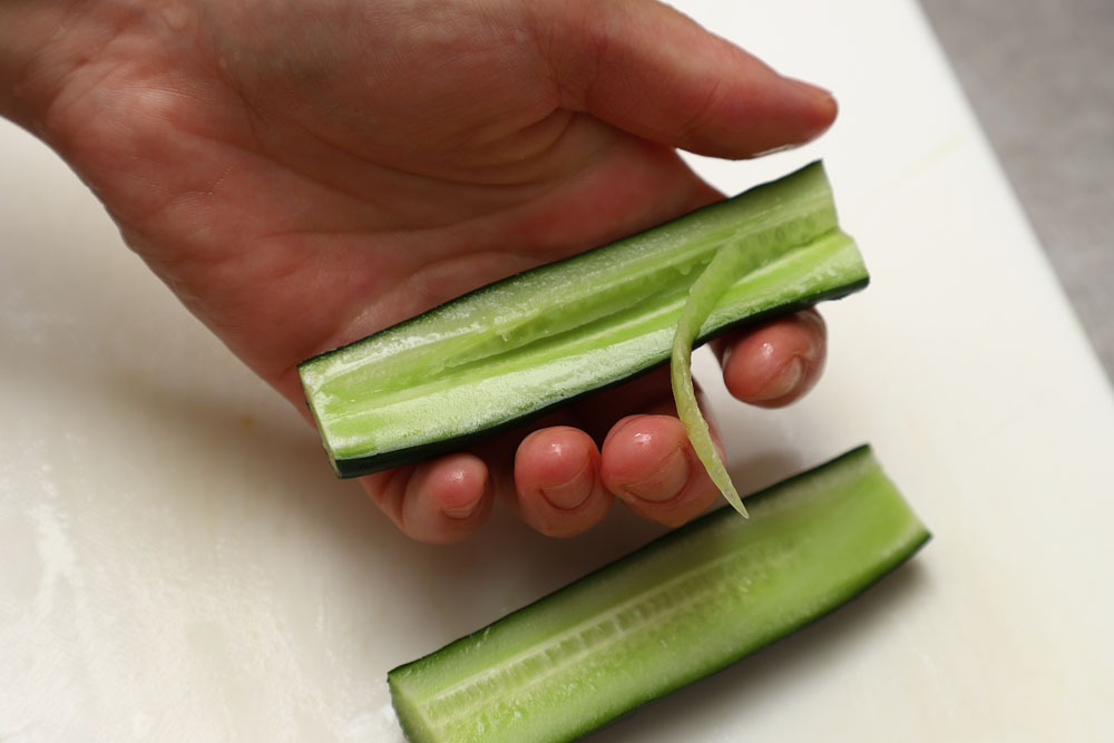 キュウリは縦半分に切り、中央にV字に切り込みを入れて水分の多い種の部分を取り除く。