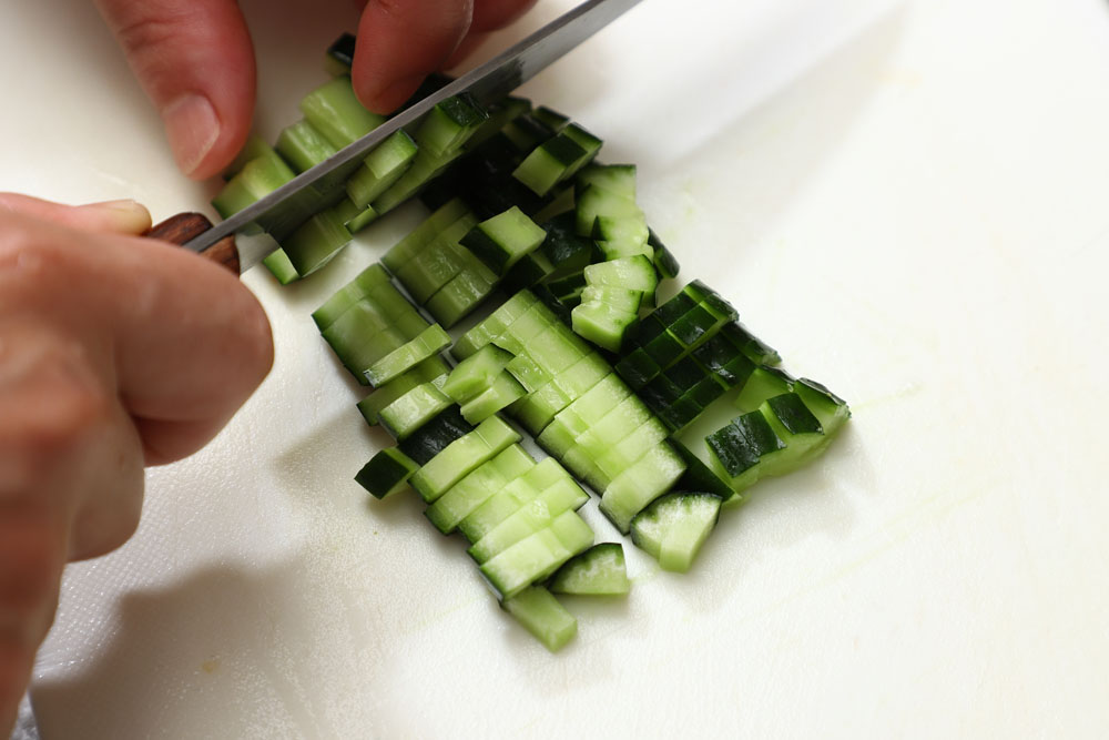 モロッコサラダにおいて最も重要なのは、野菜から水が出ないようにすること。そのためには、とてもよく切れる包丁が必要です。切れ味の悪い包丁で無理に切ろうとすると、野菜の繊維が潰れて水分が出やすくなるし、食感も悪くなります。とにかくよく研いだ刃の薄い包丁で、無駄な力をかけず、一発で細かく切る。それだけで仕上がりが全く違いますよ。
