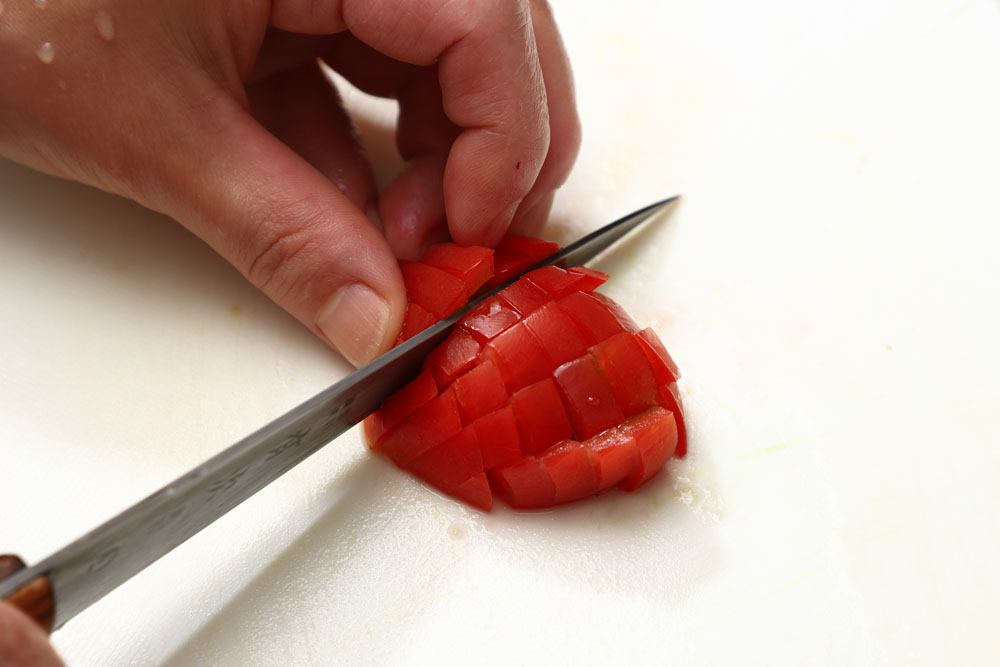 フルーツトマトは半割りにし、縦横5㎜幅にカットする。普通のトマトの場合は種を除き、果肉だけを使う。